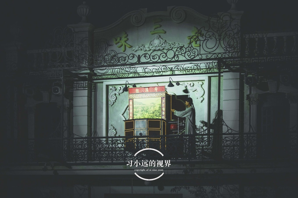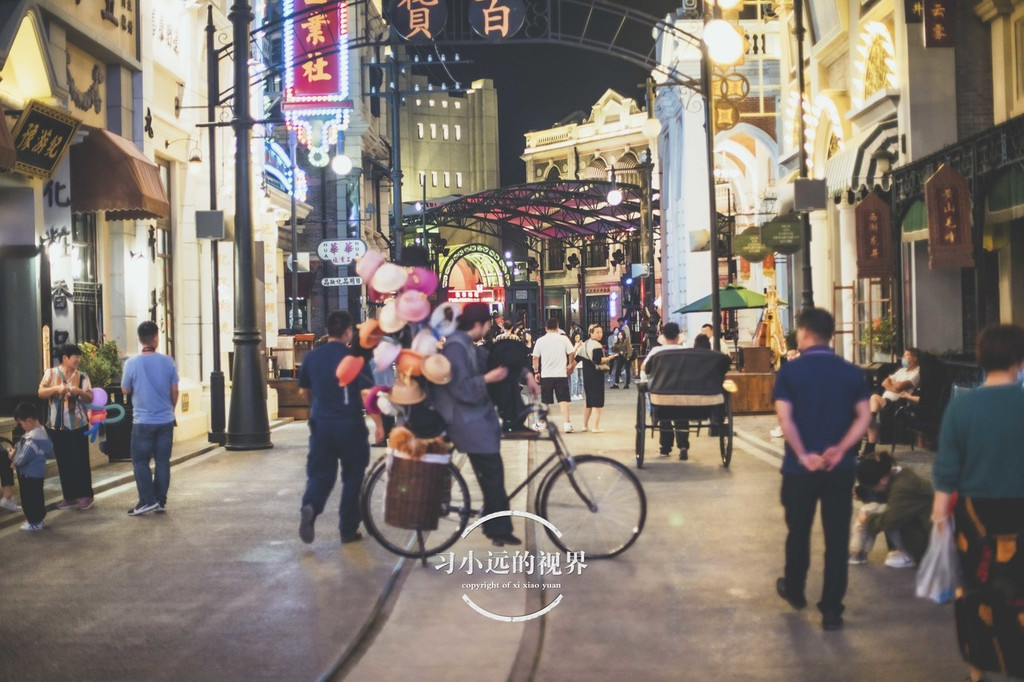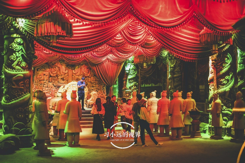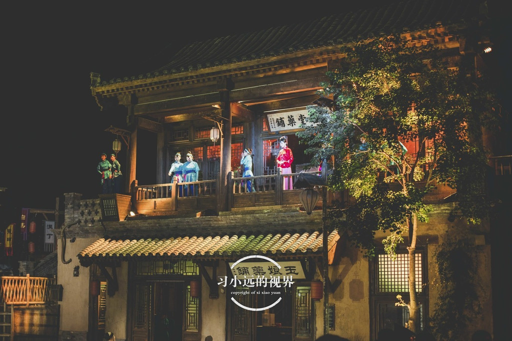 晚上除了整个表演之外,夜幕之下,灯火通明的电影大道也是拍照的好地方,还有就是灯笼铺后面的走廊,挂满花灯,非常适合拍照,带女朋友去的不妨来这里给她拍拍照。