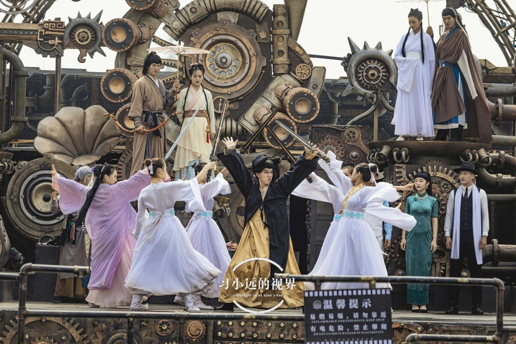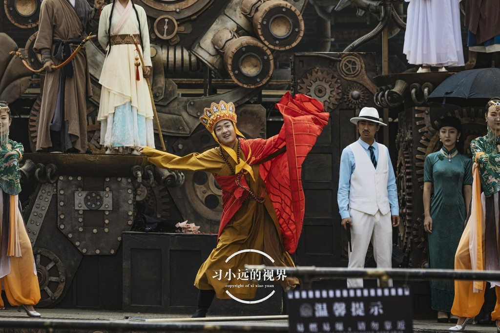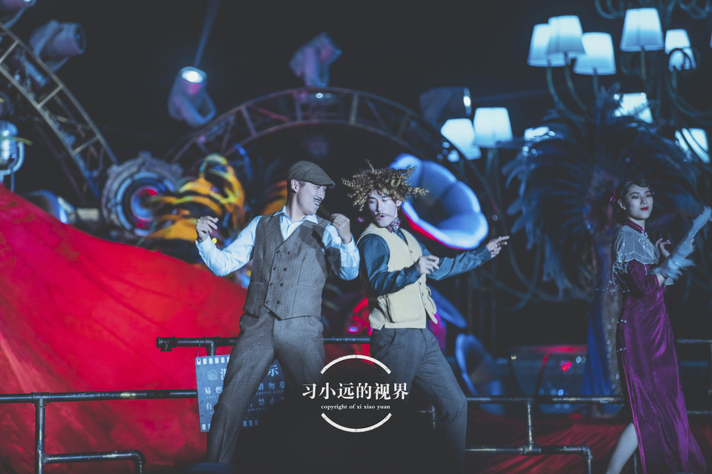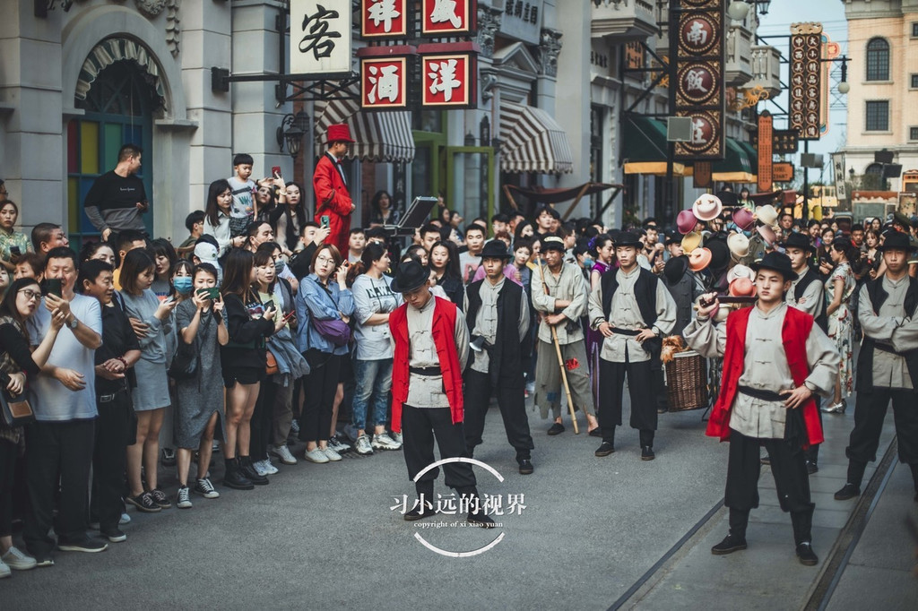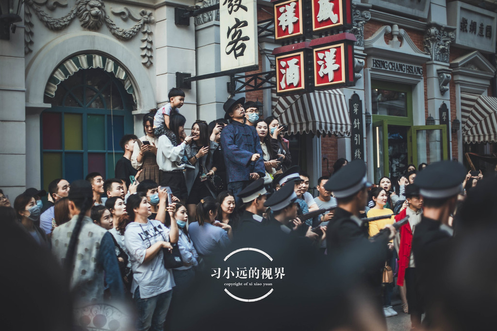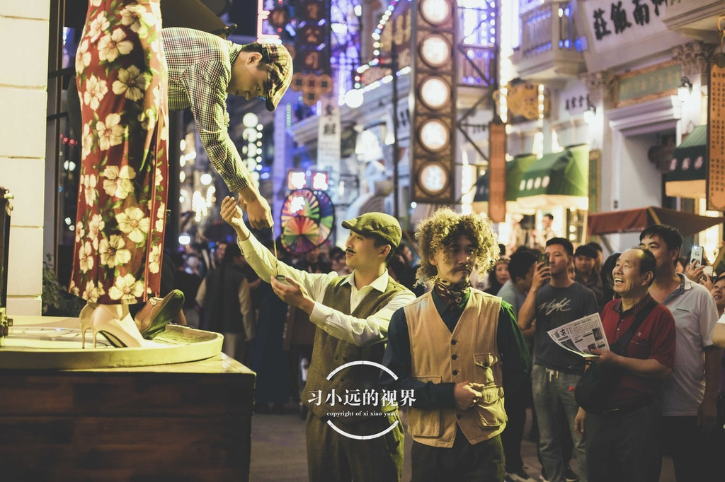 看过晚上的建业·华谊兄弟电影小镇,你就会觉得白天的建业·华谊兄弟电影小镇有点冷清了。晚上那真的是热闹,我感觉人数能翻了一倍多,主要是因为晚上有一场贯穿整个建业·华谊兄弟电影小镇的表演,从默片时代门口沿着电影大道到影视人物秀表演场地,再到玉娘药铺,战太极表演现场,一个移动式的表演在八点就拉开了帷幕。除了四个主要的表演地点之外,中间路过的摊贩也也都是有着不同的表演,一路走来真的是一路都在看戏。