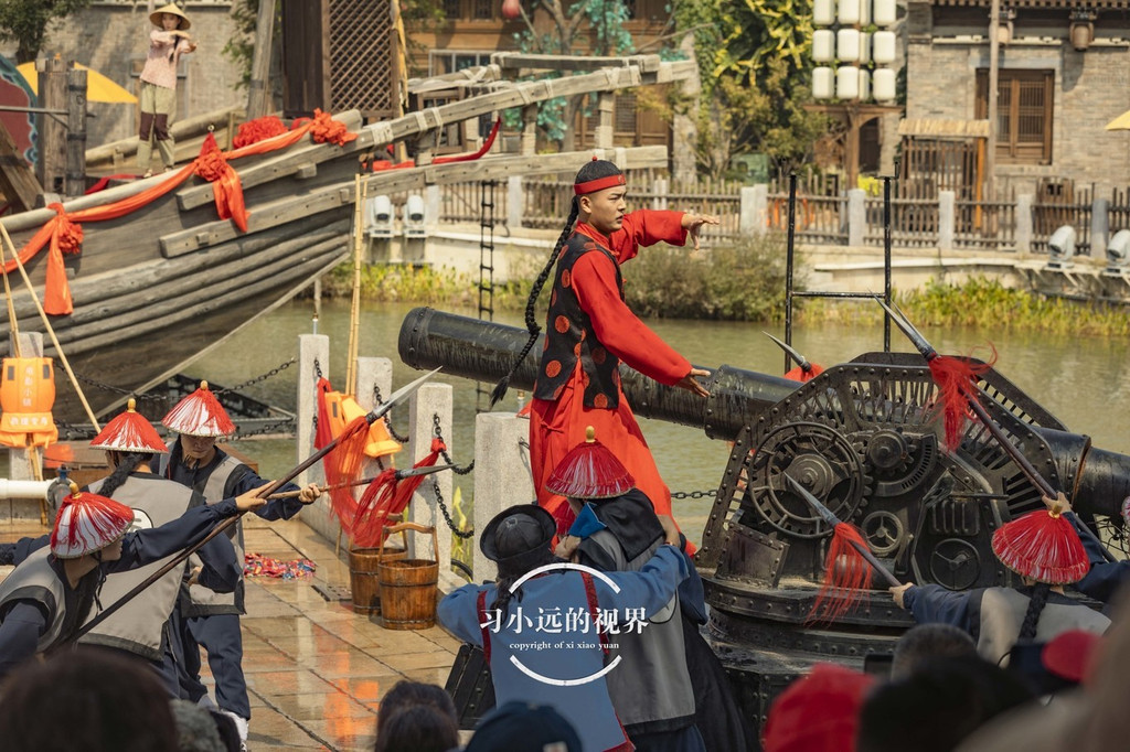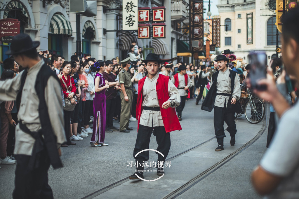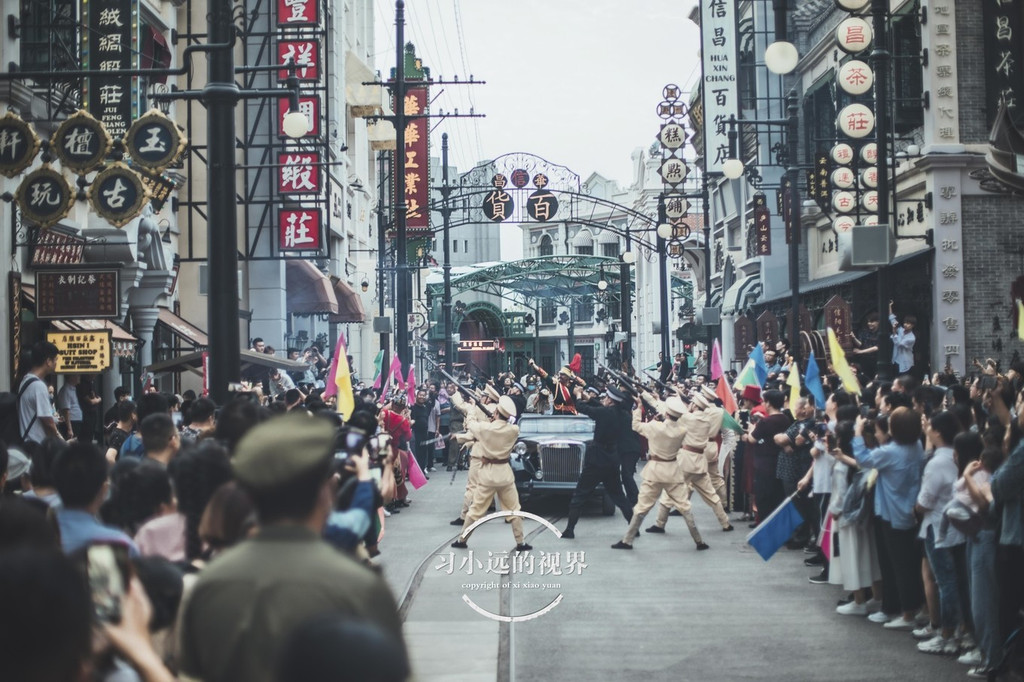 这个演出是第一天下午六点的时候看的,每天共有两个场次,分别是下午14:30和18:00,刚好我是下午来的,安排完住宿之后赶上这个场次。表演的地点就是熟悉的电影大道,安静的街道随着枪响突然就躁动起来,随后出场的有帮会头目和地方官员,之后就是实战式的枪响炮鸣,整个电影大道也是围满了游客看官。可以说是非常精彩的,具体内容我倒是记不不太清了,不过他们的表演很不错。