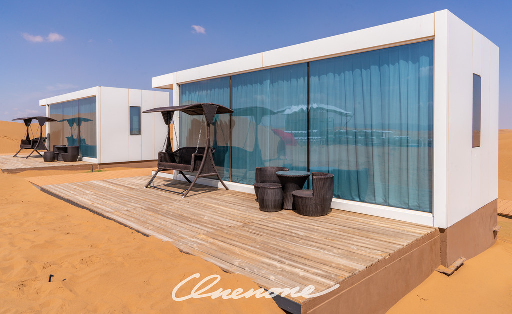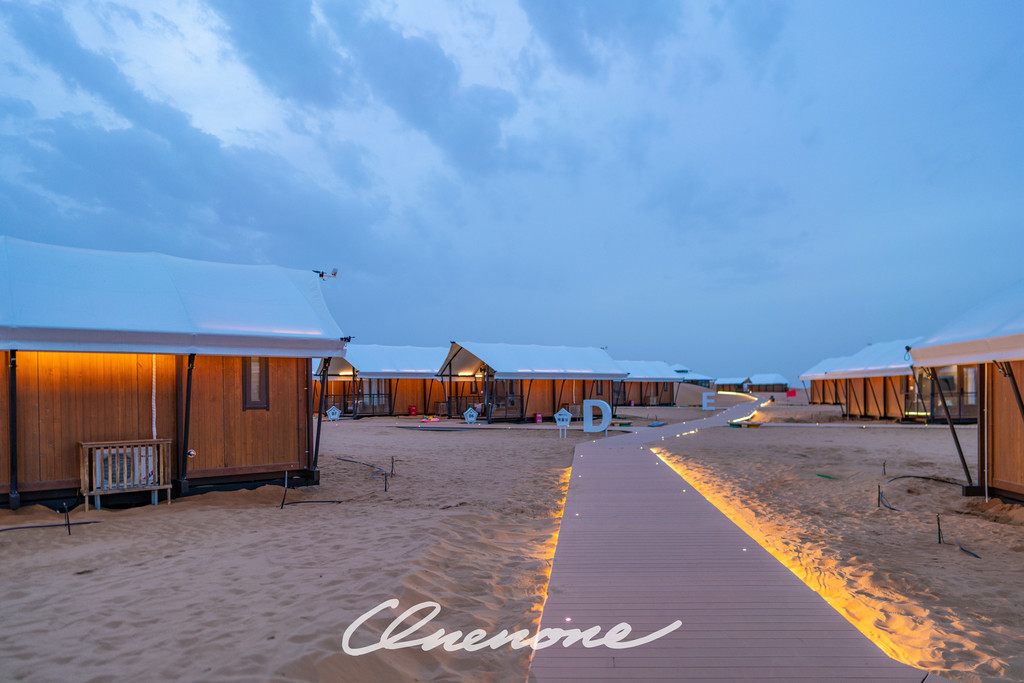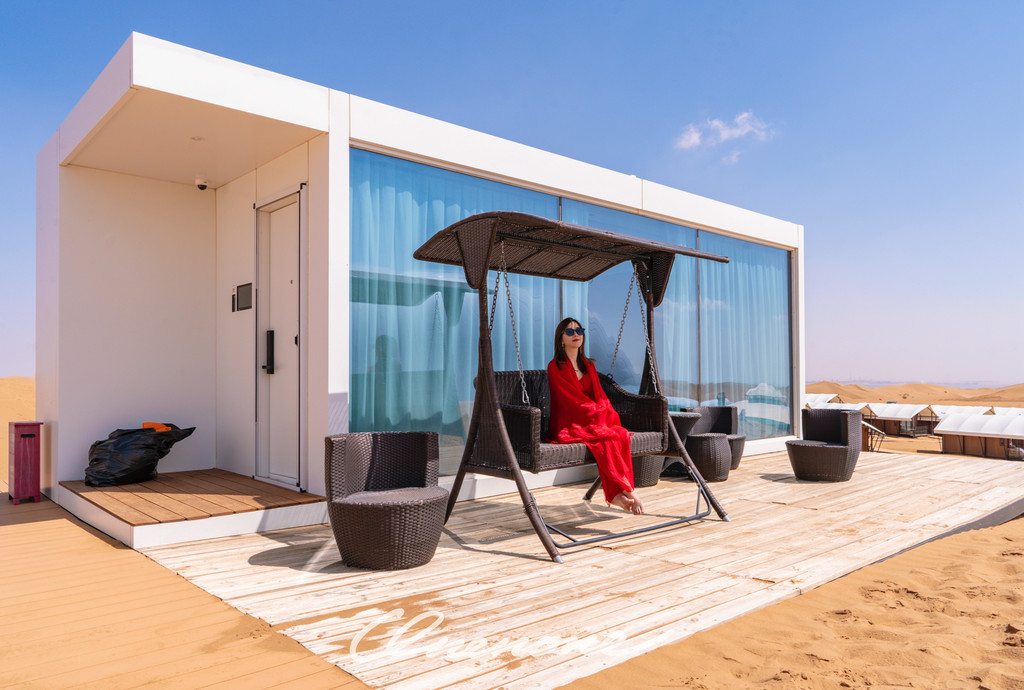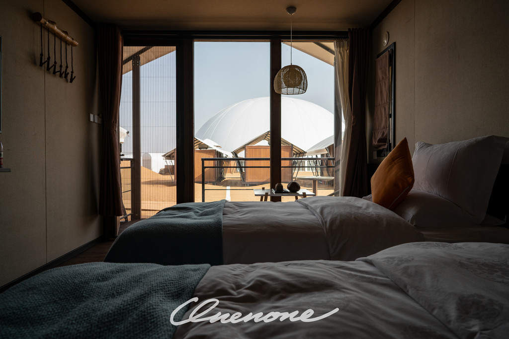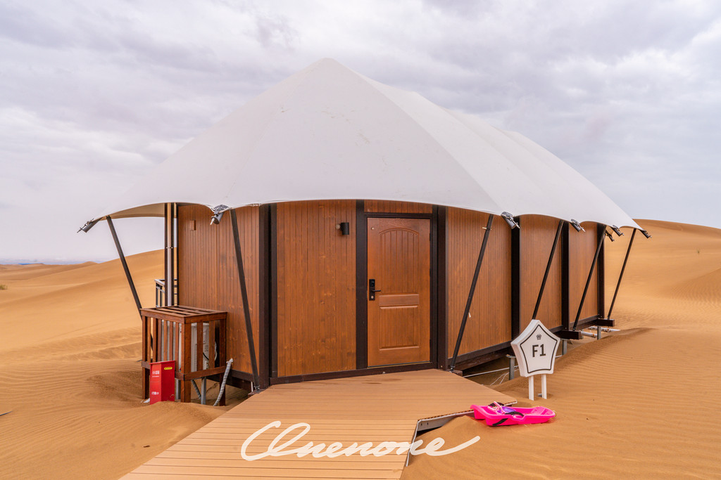 沙漠星星酒店已营业客房房型分为沙漠帐篷木屋和观景房两种,观景房仅有4间,位于沙坡顶端,视野开阔,180度全景落地玻璃窗,配合电动窗帘设施,入住客人躺在床上,就可以直接欣赏沙漠夕阳和满天繁星。帐篷木屋均为独栋,装修精致典雅,配套设施完善,室外阳台区域配有茶几躺椅脚踏,室内茶台卫浴睡眠分区合理,榻榻米双床可自行拼接成大床。格力空调、索尼液晶电视、天猫魔盒、小米旗下米家电热水壶、电吹风、电子秤、A.O.Smith电热水器、全套欧舒丹洗护备品、恒洁卫浴、康乃馨床品、农夫山泉饮用水……专用光纤,信号塔加强,客房区域WIFI覆盖较好,网速有保障。