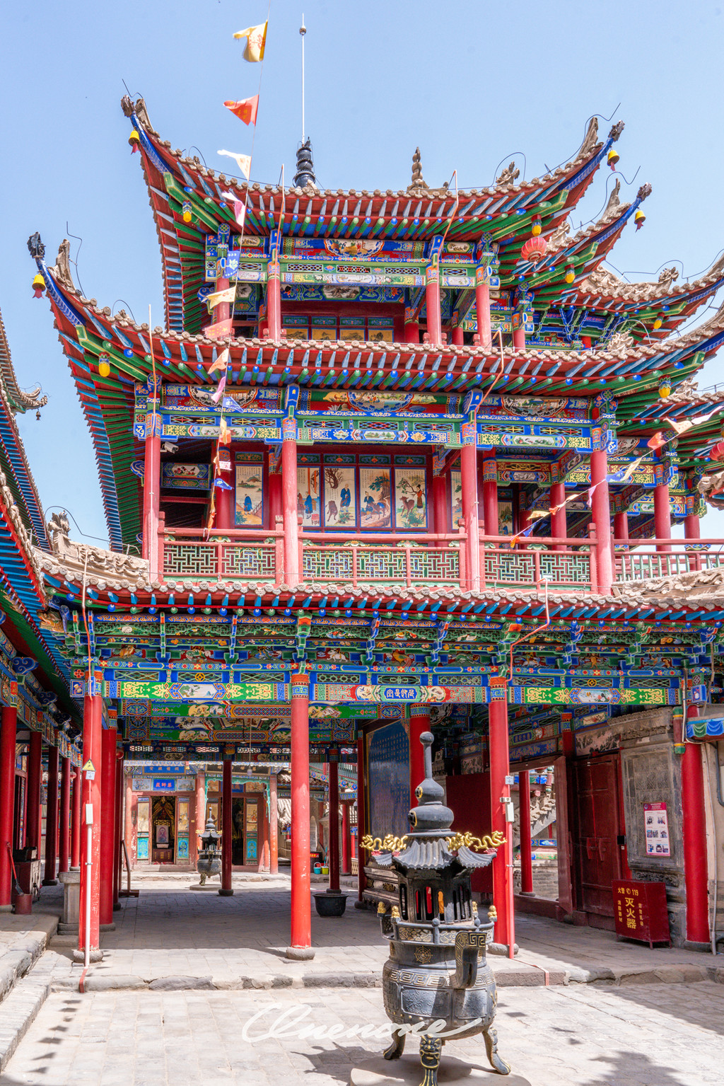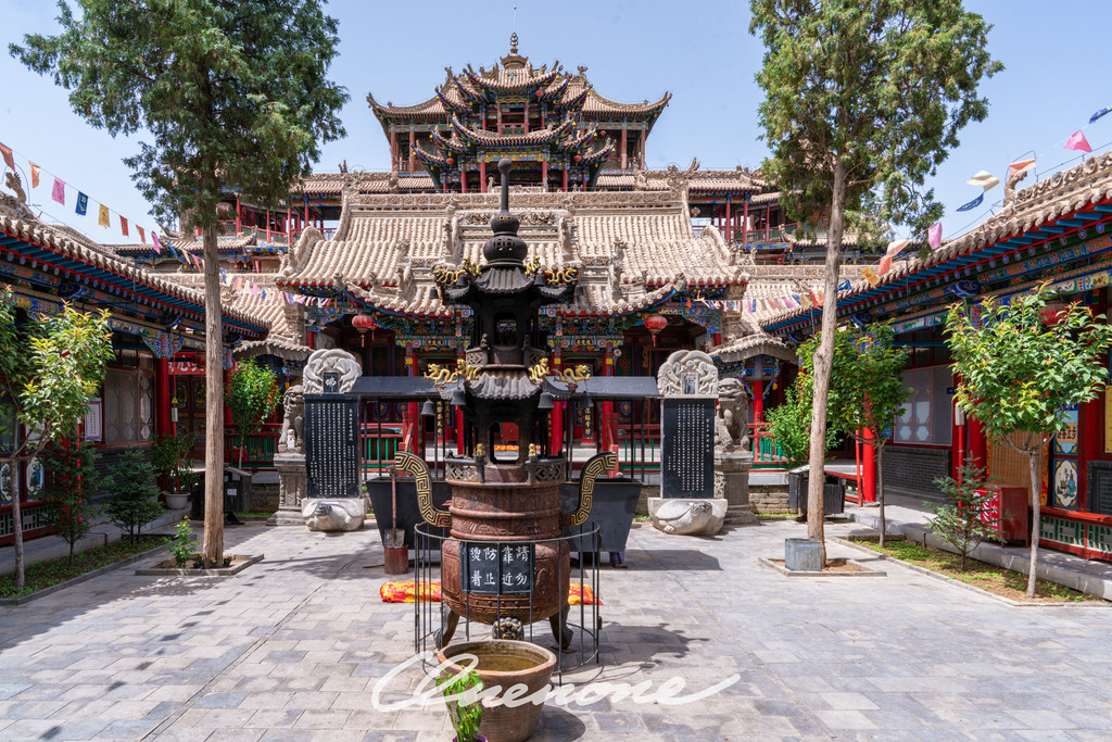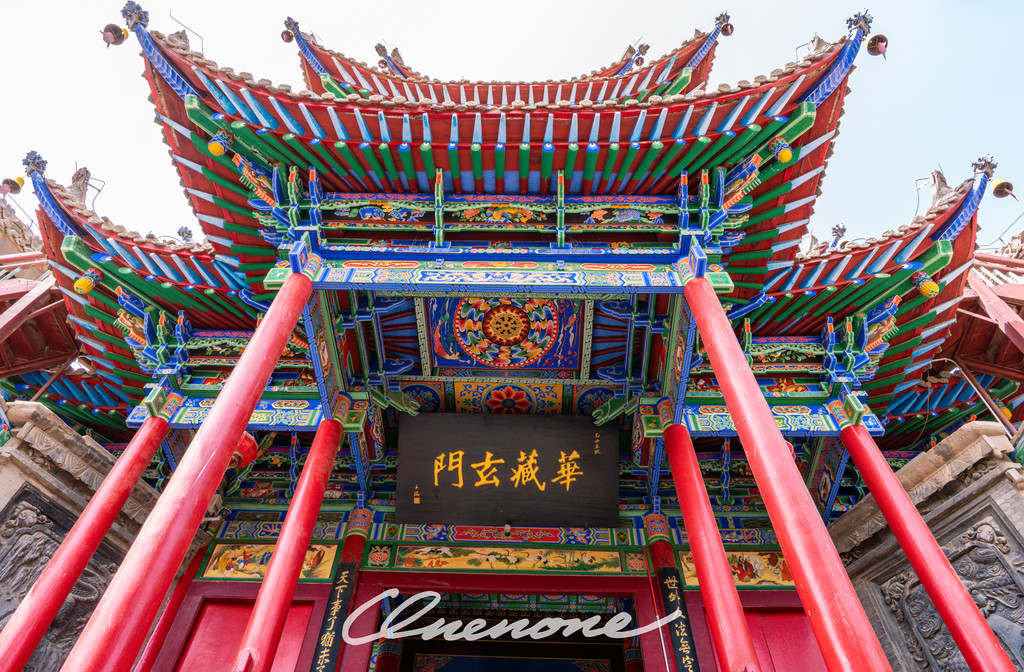 当你穿过牌坊,脚踩台阶往上走,可以看到供奉着弥勒佛的弥勒阁,弥勒阁之后是供奉着释迦牟尼坐像的大雄宝殿。而从大雄宝殿出发,继续登阶而上,就是南天门、钟楼,最高处则是玉皇阁和圣母宫,里面供奉道教中至高无上的玉皇大帝和圣母。寺庙中后楼还供奉着孔子,武楼中还有关羽关老爷的塑像。