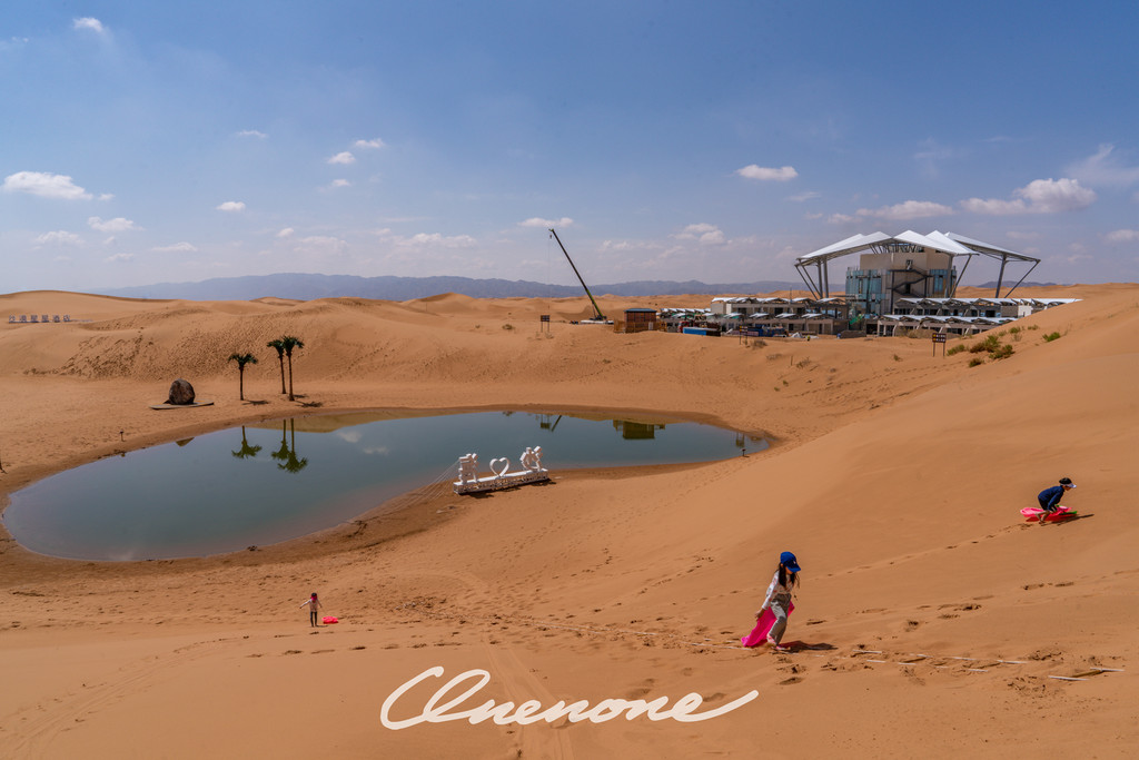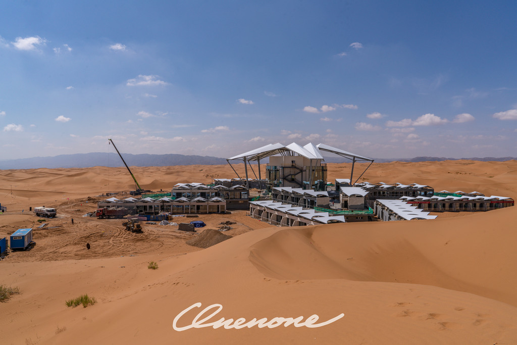 沙漠星星酒店计划建筑规模占地50亩,总投资1.4亿元,初期工程建设客房180间,将在2020年底全面对外营业,我2020年7月去体验的时候,前期营业中的40多间客房都在B区。A区是以五角星造型主体建筑展开,各个角之间有露天泳池和其它休闲娱乐区域。A区正紧张施工中,B区部分客房也在更新修缮和设备调试。