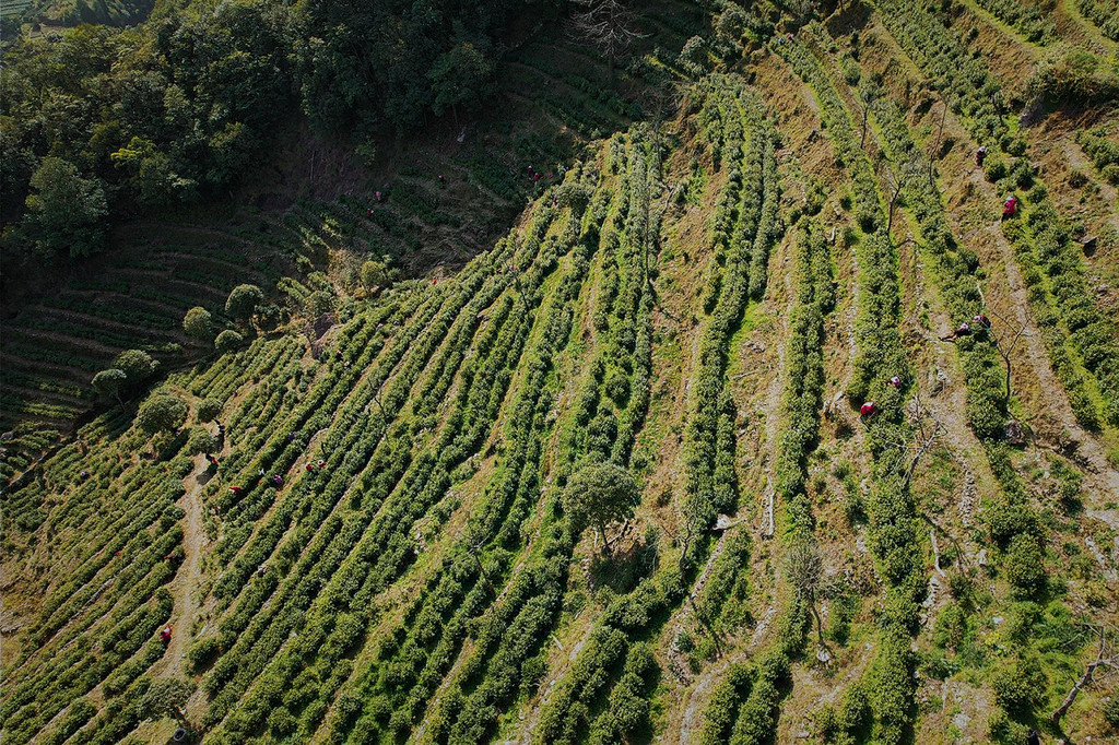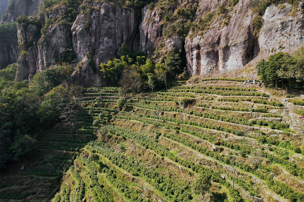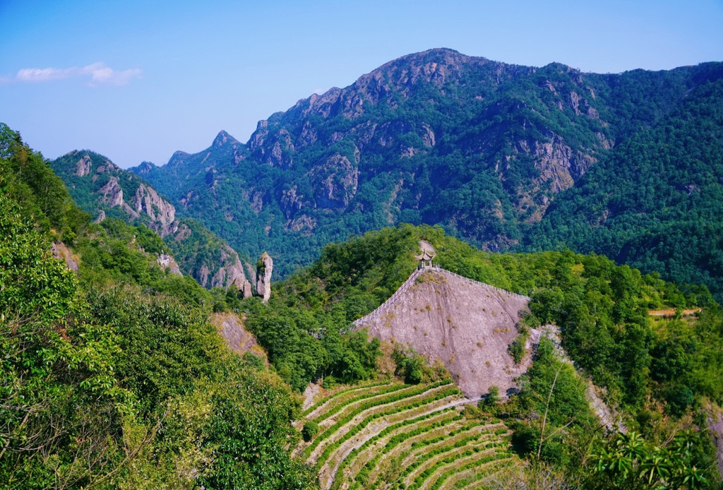 在群山环抱的山坳深处,藏着一片汇聚 雁荡山 天地灵气的仙茶——高山·雁荡茶。因其茶叶生长地,四周都是岩石峭壁,被人们戏称为“岩茶”。茶叶口感,甘甜清冽,自带“兰花”芬芳,馥郁醉人。嗅着春茶的清香,如同沐浴着 春日 一样令人心情舒畅。这片被群峰环抱的 雁荡山 茶园,在蓝天白云的映衬下格外迷人,像是一幅巨型风光画卷悬挂山间,奇妙无穷。登上陡峭的山坳处的凉亭,可以眺望到万山丛中的一潭碧波,这便是如翡翠般耀眼的仰天湖。