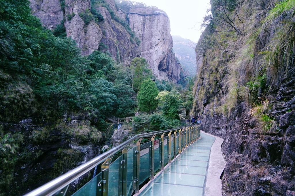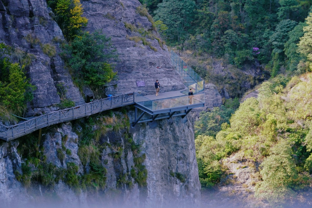 一座卧云台,屹立于绝壁之上 ,揽山抱云 ,以高空视角俯瞰绝景。抬头是巍峨是山峰,低头是千米深渊。站立在卧云台,随手一拍都是一幅山水画巨作。继续向前,会经过一段约57米长的玻璃栈道,徒步其间,有一种腾云驾雾、凌空飞走的妙趣。