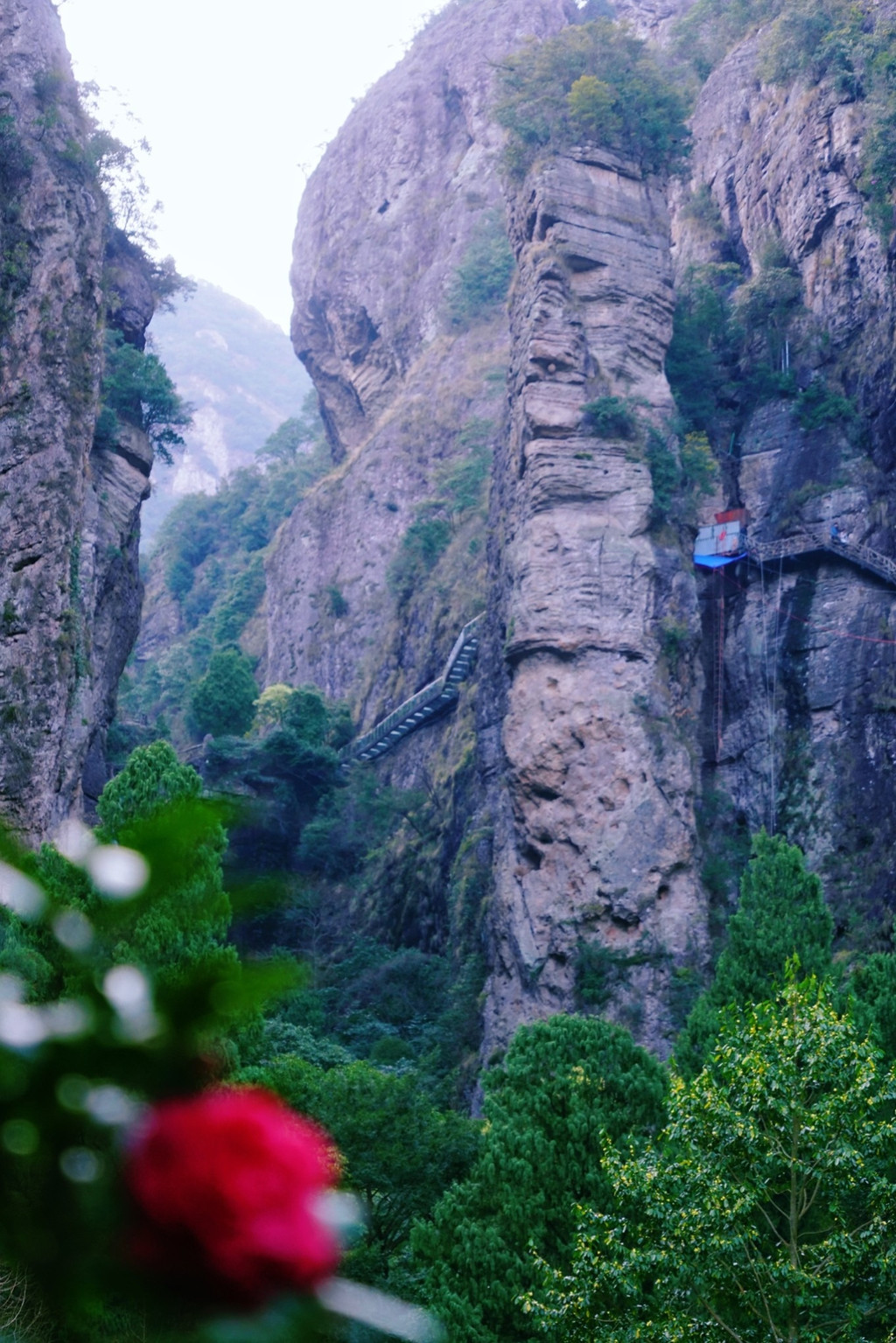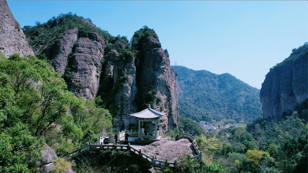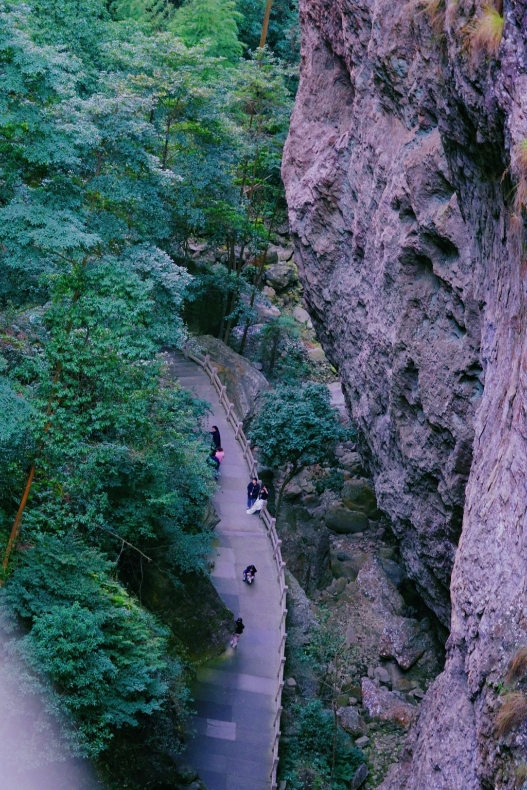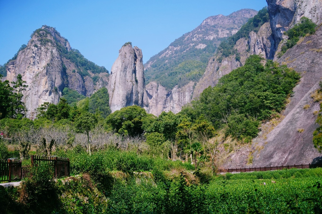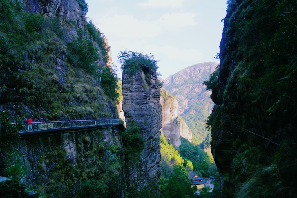 “雁荡冠天下,灵岩尤绝奇。”徒步山中悬壁栈道,沿着蜿蜒盘旋的山路前行,四周参天古木环抱,灵岩群峰村落有致的环列,犹如一支雄壮浑庞的军队,潜伏在深山幽林之中。