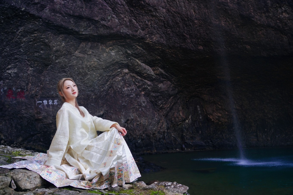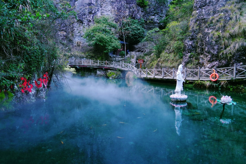 为了营造一种仙侠世界的神秘感,这里日日水汽氤氲,朦朦胧胧,行走其间,宛如走进了一片世外 桃源。一潭碧池,清澈见底,烟波浩渺,如临仙境。亿万年沧桑,雁过留声。山下有一座侘寂风的庙宇,院前绯红的玉兰花绚丽绽放,院后是奇峰罗列的断肠崖。