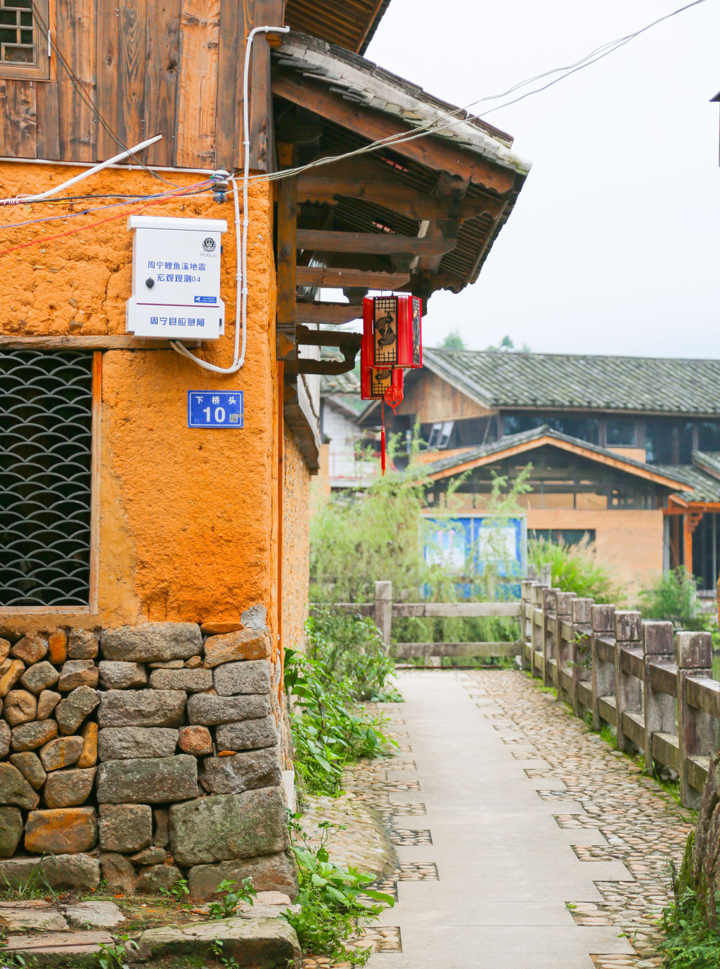 整个古村,沿着蜿蜒的小溪而过,溪边的老街还保留着旧日的韵味:青石板、木房子,古老的土墙和泛黄的木门,老房子上挂着一些红色灯笼,有点陈旧,却展现出了人与鱼之间和谐共处,融为一体的美好画面,独特的“人鱼”文化。