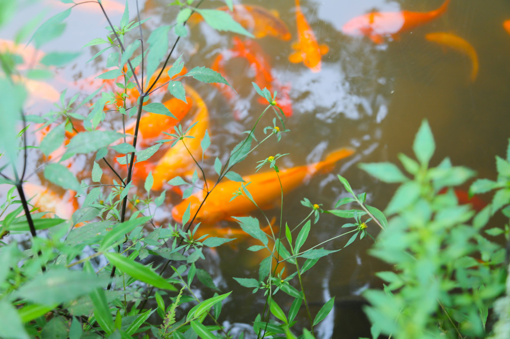 一条潺潺小溪,池中可见成群结队、五彩缤纷的鲤鱼在溪中尽显“主人翁姿态”。