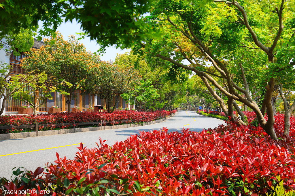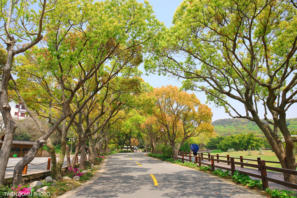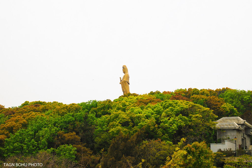 下了船后沿着右手边走,或者可以坐岛上的汽车到各个景点,到各景点的费用不同,可以根据各个的爱好去到各景点哦。而我呢选择用走路的,我想把普陀山的每一个地方都好好的打卡一下。所以我慢慢的走路,不要错过每一处景点。走在路上无处不在的绿色植物,让眼前豁然开朗,绿色的樟树刚刚换上了新叶,嫩嫩的叶子,翠绿色的一片,沿着公路一直到山顶上处处都是绿色,绿意盎然的景象呈现在眼前。