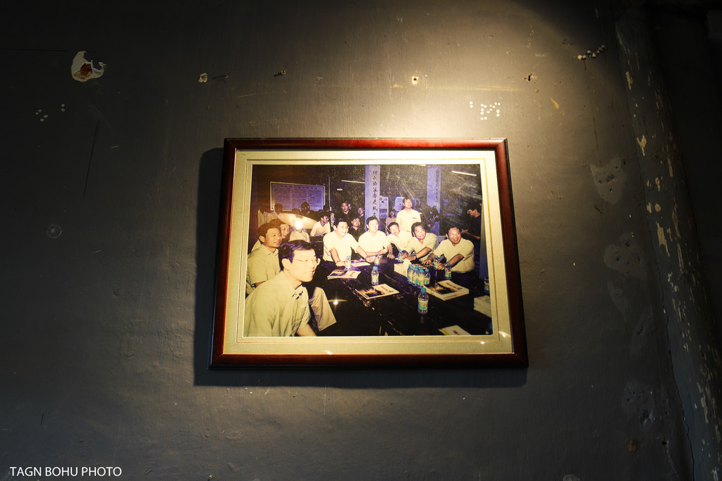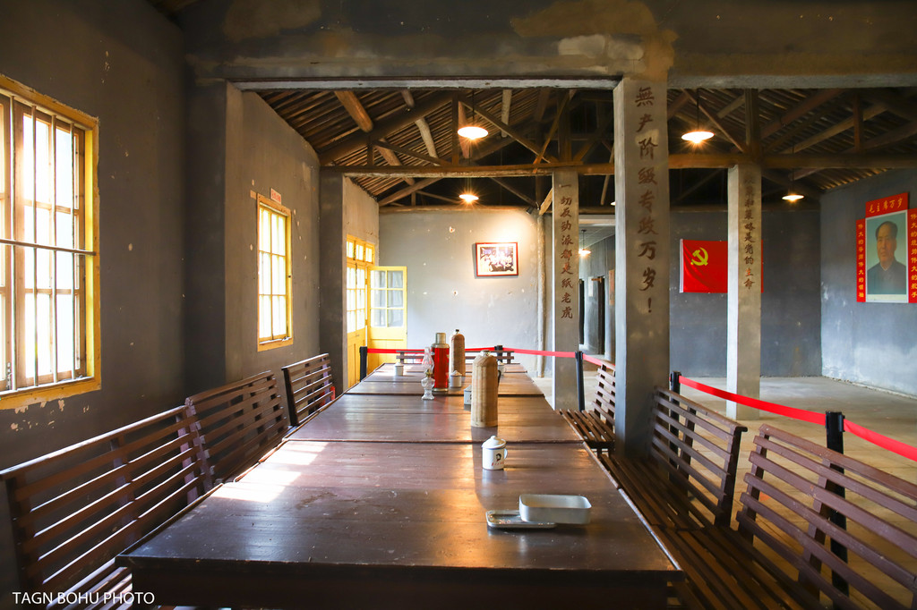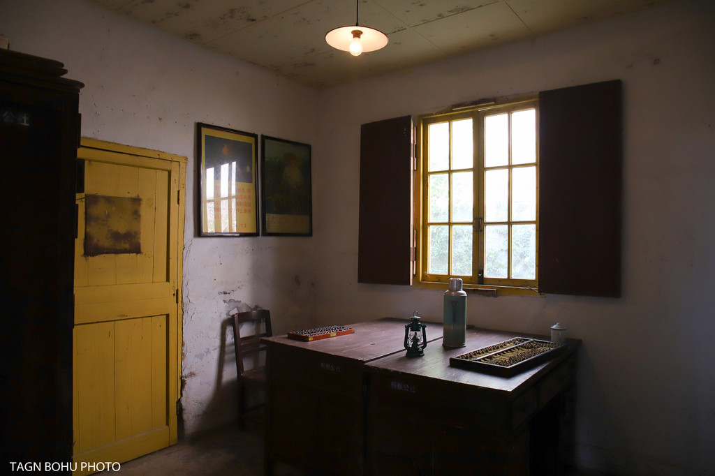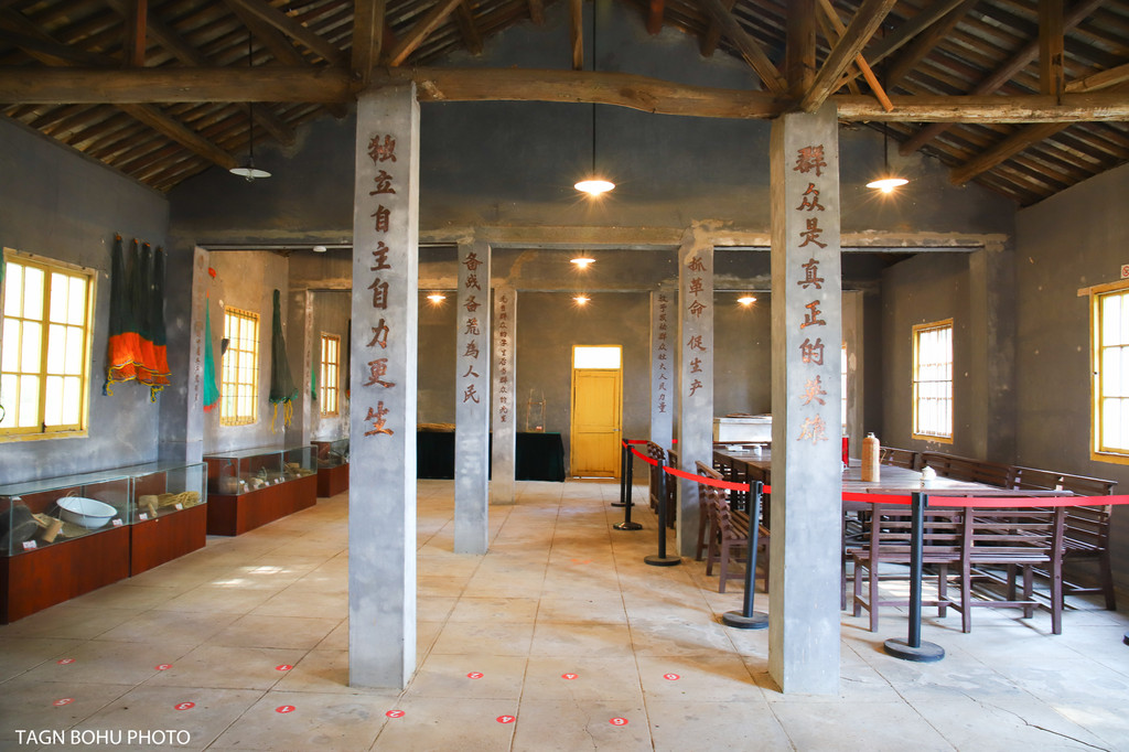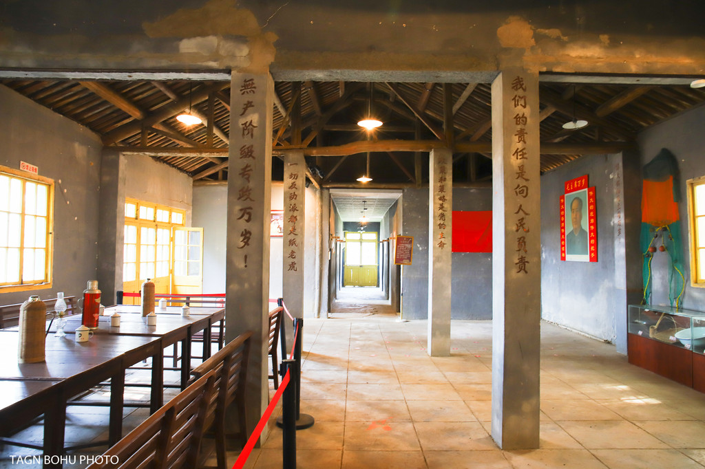 墙上挂着各种艰苦奋斗的标语图片,桌子上的油灯,茶杯,算盘,水壶。进到屋子里右边是开会的会议室一样,木桌上摆着茶壶,柱子上写满了标语。在这里仿佛让我感受到了当年那个年代正在开会的那个场景。