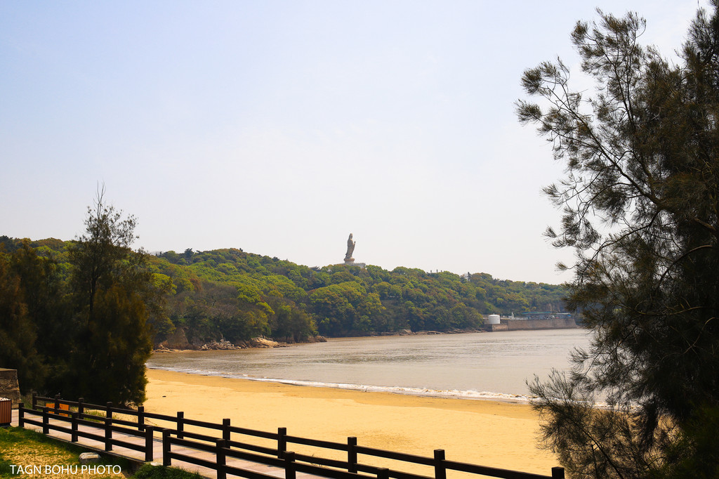 从另一侧看到南海观音仿佛是在树林中漂浮着,每当清晨有雾的时候这里就变成了仙境一般,在海南观音大门入口左侧也有几座寺庙,可以到下面去看看,周围就是大海,吹着海风,虔诚的去拜一拜南海观音,听说很准哦。