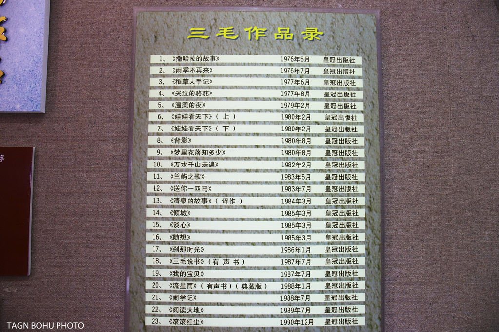 如今,祖居的正屋宅院经修缮,被布置成三毛纪念陈列室,堂前门框上,显赫挂着竹青先生题写的“三毛祖居”匾额。三毛的家人为纪念馆奉献了众多三毛的遗物,除了手稿、画作外,还有她浪迹天涯的旅行袋和旅游鞋,钟爱的手镯、彩石、鼓铃、陶罐、骆驼头骨等。
