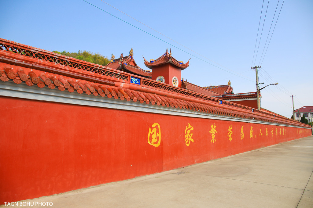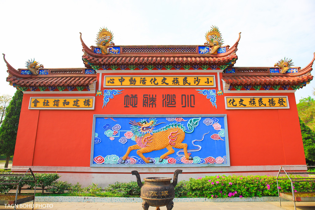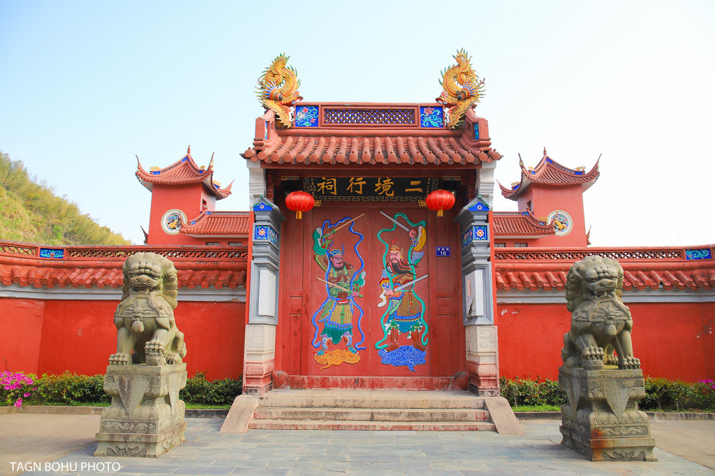 走到正门一侧有两头狮子,红色的外墙,大门前二境行祠几个大字,栩栩如生的门神在看护着,大门前有一墙上面有一只麒麟腾云驾雾般的图案,寓意着这里吉祥安康。