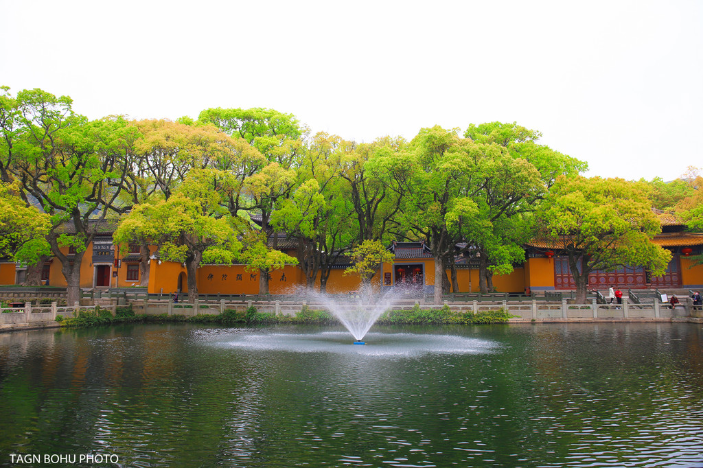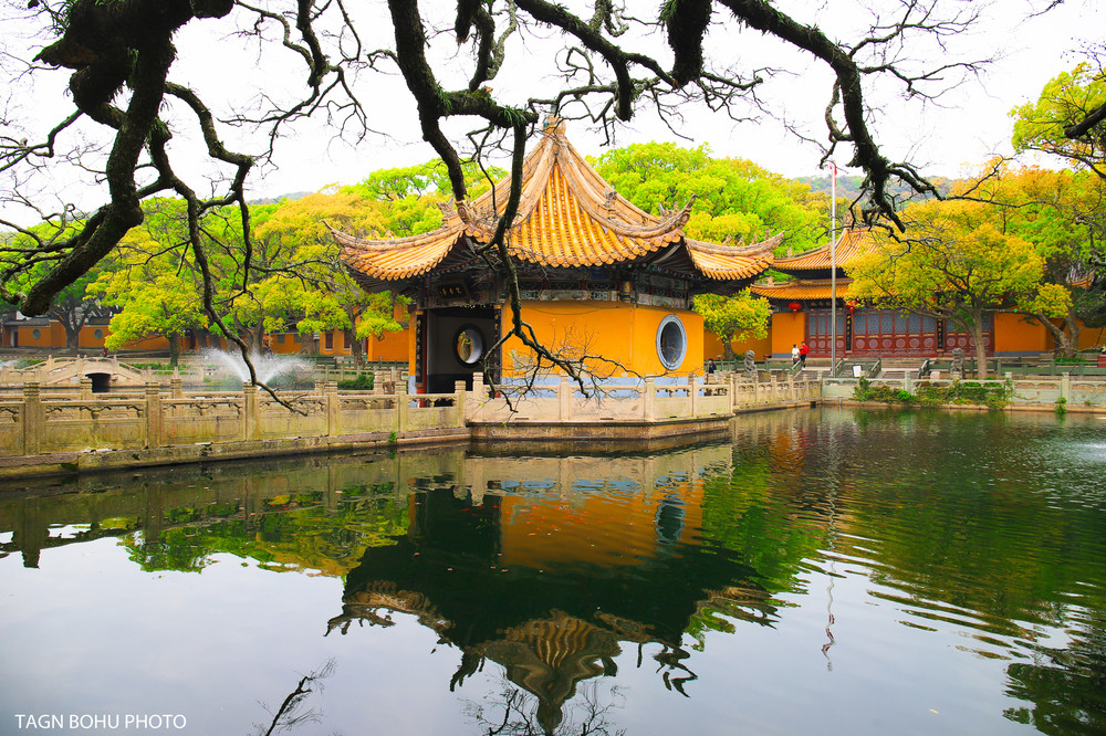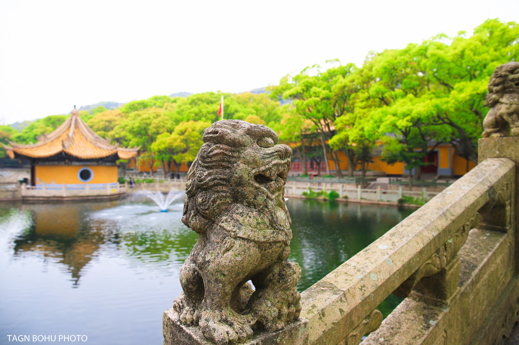 普陀山有三寺,三宝,三石,三洞,分别为普济禅寺、法雨禅寺、慧济禅寺,多宝塔、杨枝观音碑、九龙藻井,磐陀石、心字石、二龟听法石,朝阳洞、潮音洞、梵音洞,还有十二景点为莲洋午渡、短姑圣迹、梅湾春晓、磐陀夕照、莲池夜月、法华灵洞、古洞潮声、朝阳涌日、千步金沙、光熙雪霁、茶山夙雾、天门清梵。如果你想要把这么多的景点都看完的话,那么一天的时间根本是看不完的。如果你在岛上只玩一天的话,那么建议大家先选择一些比较著名的景点打卡,剩下的下次再去玩了。 就在在普济寺前有好几个水池,寺庙被绿色的樟树包围着。