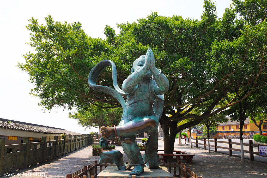 沿着路往海边的方向走去,看到不远处南海观音像就出现在眼前了,海南观音面向着南海站立在山上,再往山上走,路上会遇到一些小猫正在地上睡觉着,这些猫猫也不怕人,感觉猫咪看多了游客都不怕了生了。再往山上走再下一段陂路就来到了海南观音的大门入口处。两头狮子正在看着门呢,来普陀山旅游一般上了岛后第一个要去的地方就是海南观音了。整个岛上最著名的就是观海观音。先到这里拜一拜再到各个景点去,这样游玩的线路会比较好一点哦。