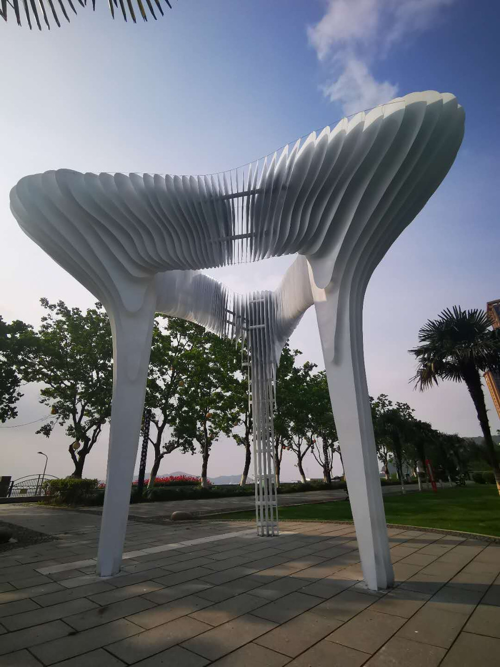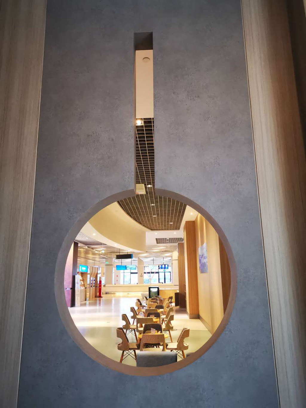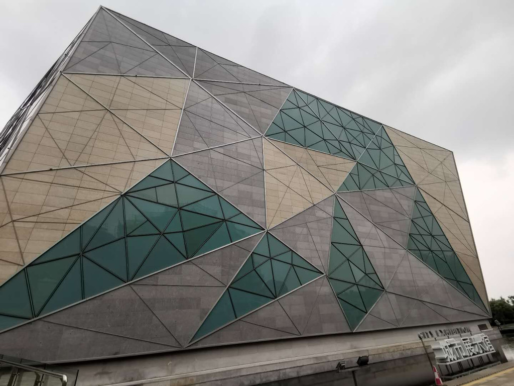 建筑外立面以银灰色的几何块面分割,凹陷间隙处以蓝色填充,象征舟山岛礁林立