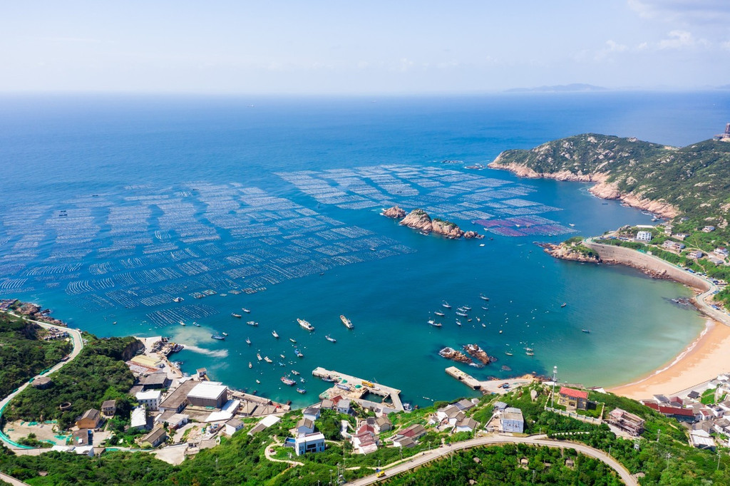 蔚蓝的大海在太阳的映照下水天相连、更显波澜壮阔。养殖贻贝的白色浮子在阳光照耀下闪烁着点点银光,渔舟在碧波荡漾中穿梭,构成了一幅美丽的海上牧场图。