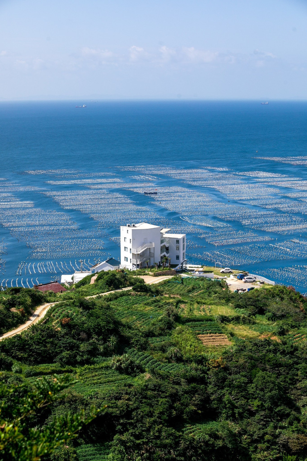登上峰顶,居高临下,山、礁、滩、云、天、海,白色浮子,渔船,最美的海上牧场图尽收眼底。