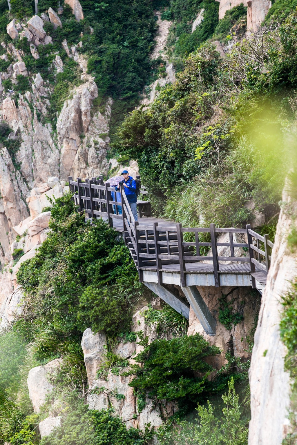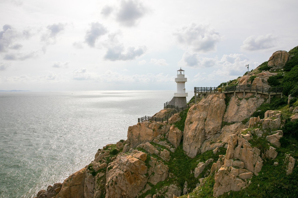 完全沿着海的栈道,有台阶可以下去, 栈道栏杆并不非常牢固,要小心一点。老实说,来六井潭就是奔着灯塔而来,矗立在岩石上,终年为渔船保驾护航。