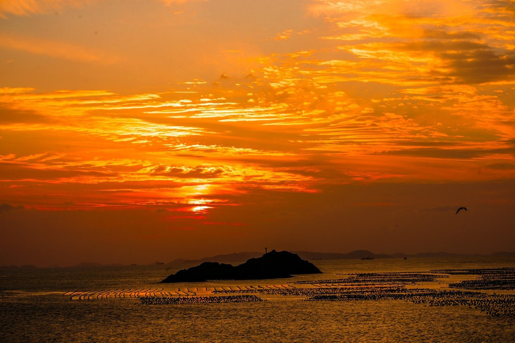 枸杞岛的美已经无需赘述。枸杞岛干斜村是海上牧场最密集的地方也是欣赏海上日落最美的地方,一片贻贝浮子间,小船或行驶或停泊在海面上,和落日交相辉映,怎一个美字了得?