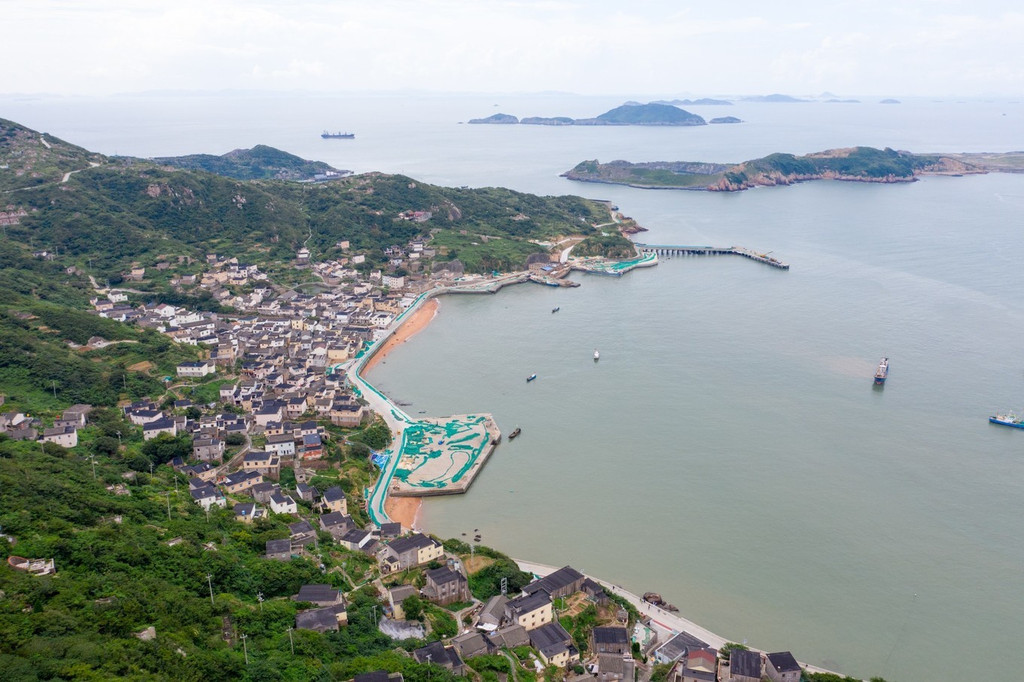 在这里放飞无人机,可以看到岛上远处五颜六色的房屋。这里也被称为“东方小希腊”,村村有沙滩,家家海景房。