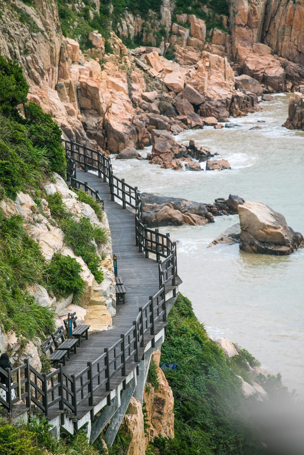 木栈道,观涛听海,把酒临风,面朝大海,春暖花开,右手边是一望无际的大海,海岛和渔船在海面上若隐若现。