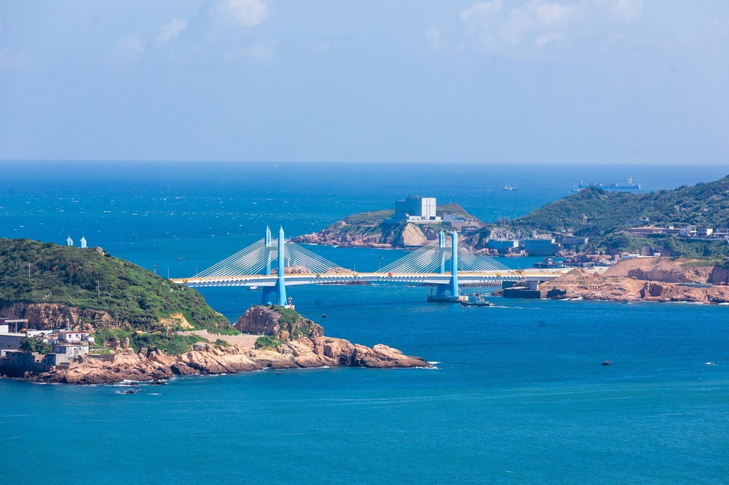 远处的三礁江大桥,感觉很美,在蓝天碧海映衬下更美了。三礁江大桥是连接枸杞岛和嵊山岛的桥梁。三礁江大桥是一座跨海大桥,采用斜拉索,对改善两地的经济有着重要作用,同时还推动了两地的旅游业,使得两地之间不再仅仅靠轮渡。