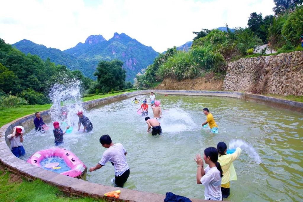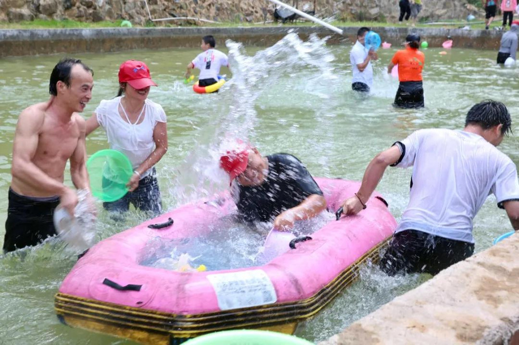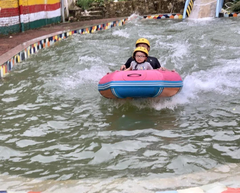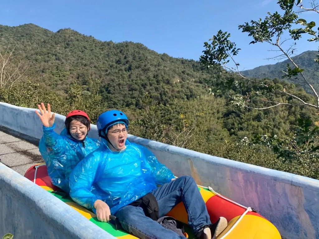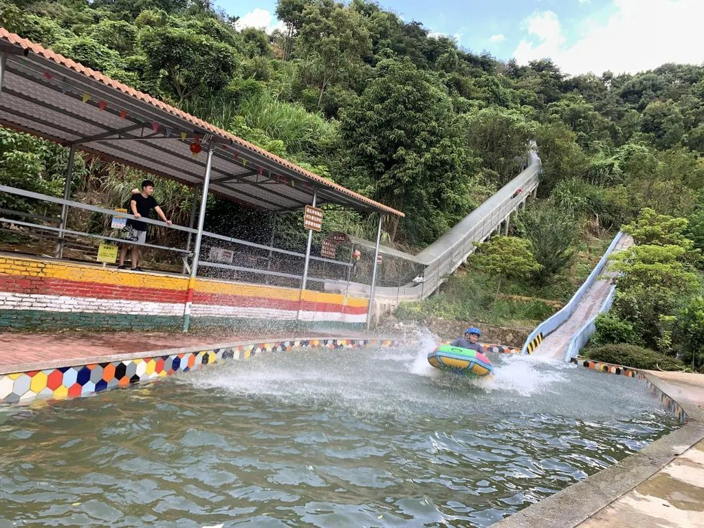 两人一组,坐上橡皮艇在水流的冲击下沿着滑道滑下山谷