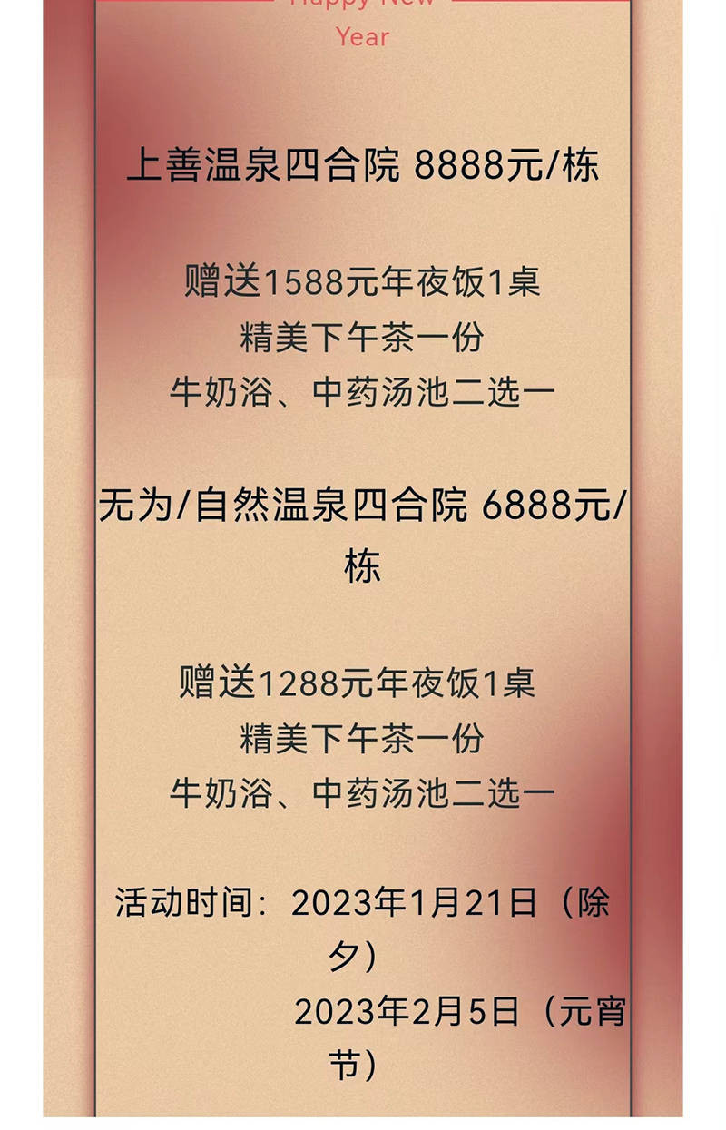 你也可以包个印象温泉小院过大年。为院门贴上“福”字,放一束璀璨的烟花,举杯互道一声新年快乐,在热闹的欢笑声中,品味年味乐享生活。