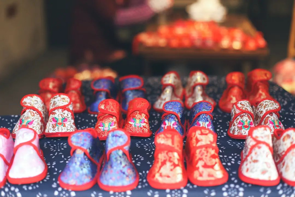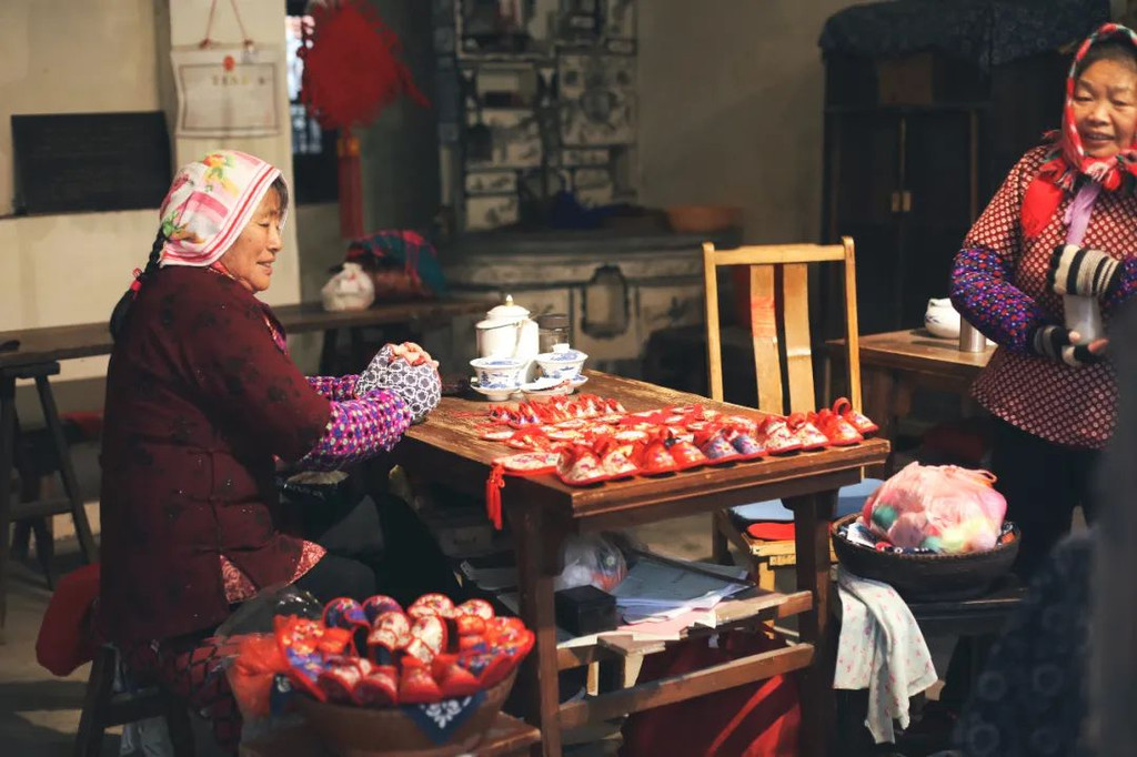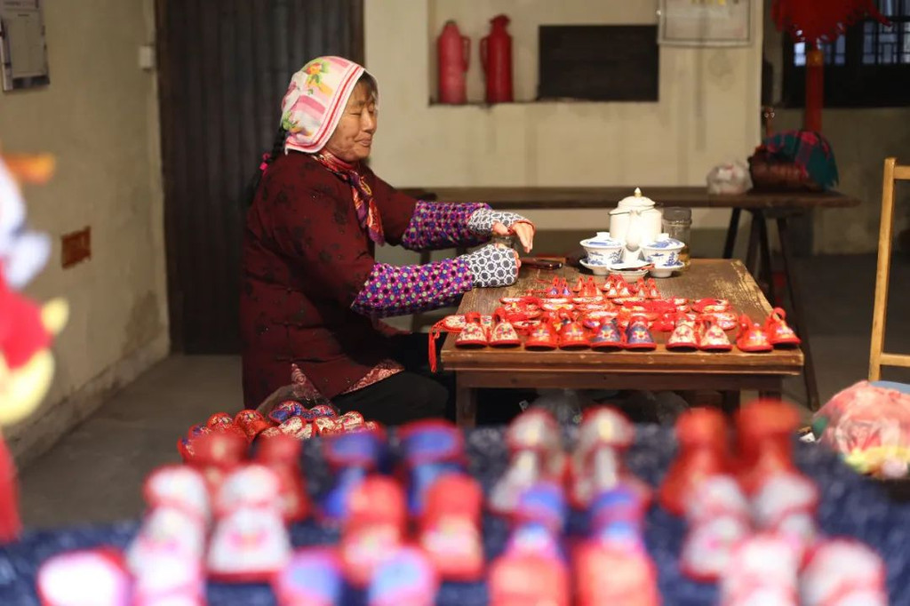 这色彩鲜艳的布鞋,是上一辈人勤劳的双手,一针一线缝制。以前在江南,鞋子都是这样手工制作的。