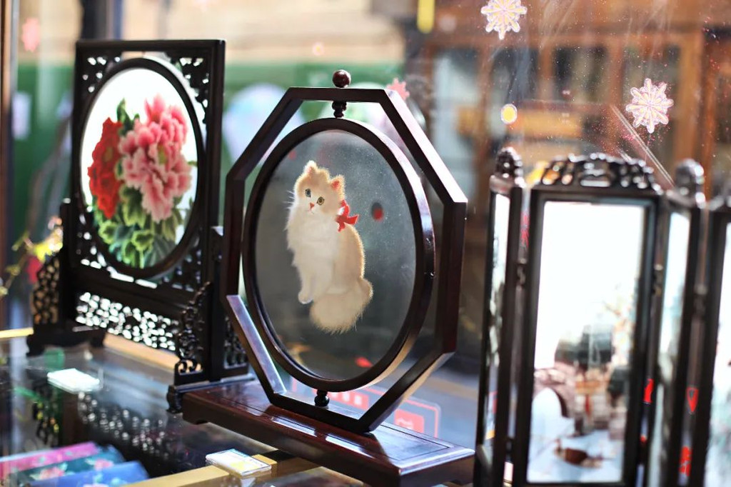 锦绣江南,当然离不开赫赫有名的苏绣了。在贞丰民俗文化街,还有一家绣艺坊。里面售卖大大小小的刺绣产品,也有展示绣娘是如何刺绣的。
