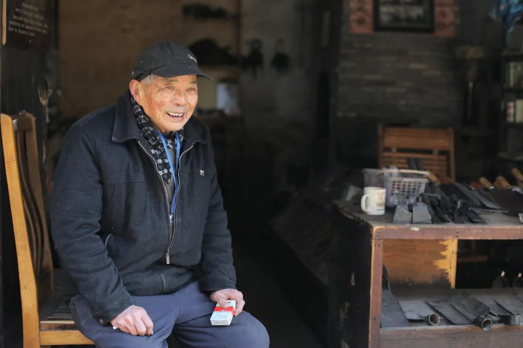 戴爷爷说:“我今年83岁了,从13岁就开始打铁,已经打了70年的铁了......”