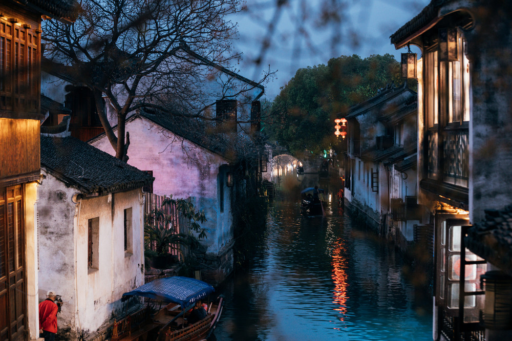 这是夜色中的梦里水乡,真不失“中国第一水乡”这称号。曲径通幽的深街长巷,一幢幢青砖黛瓦的木楼和一户挨一户的沿街商铺,热闹中彰显着繁华。
