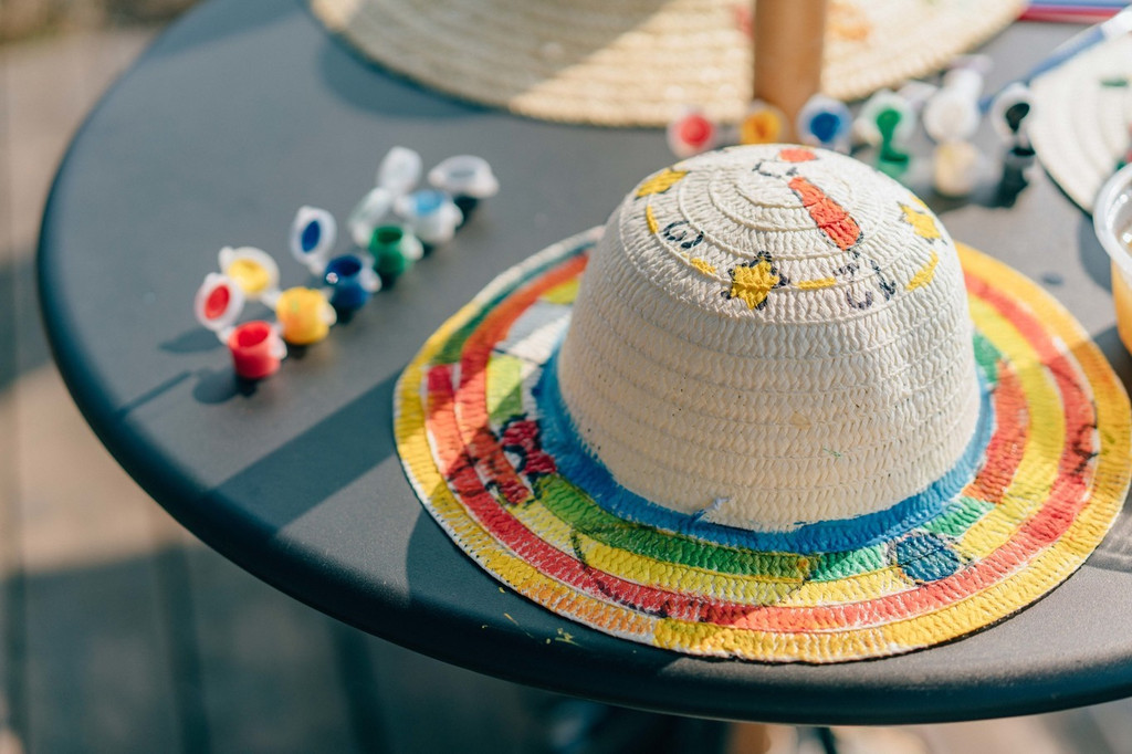 距离村史馆不远,是香村书坊,凉台靠近湖水,后面是一个秀珍的宠物乐园,非常适合带孩子来玩儿,书坊还提供了小草帽和颜料提供给小朋友彩绘。