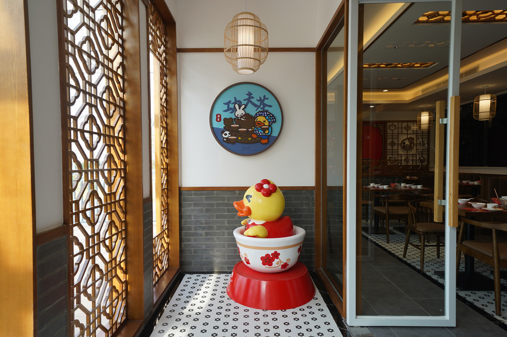 简单的整理一下东西之后,又到了美好的午餐时光。听说这里有网红打卡的小黄鸭餐厅。小孩子肯定很喜欢,听名字就很萌。前往目的地。看到门口大大的小黄鸭,太可爱了。走进去一看,里面的布置也是小黄鸭的,小黄鸭的菜谱,墙纸,餐盘,连菜品也是小黄鸭图案的,料很足,很足。这种朋友圈点赞率一定极高,而且相信不少人会被种草哦。