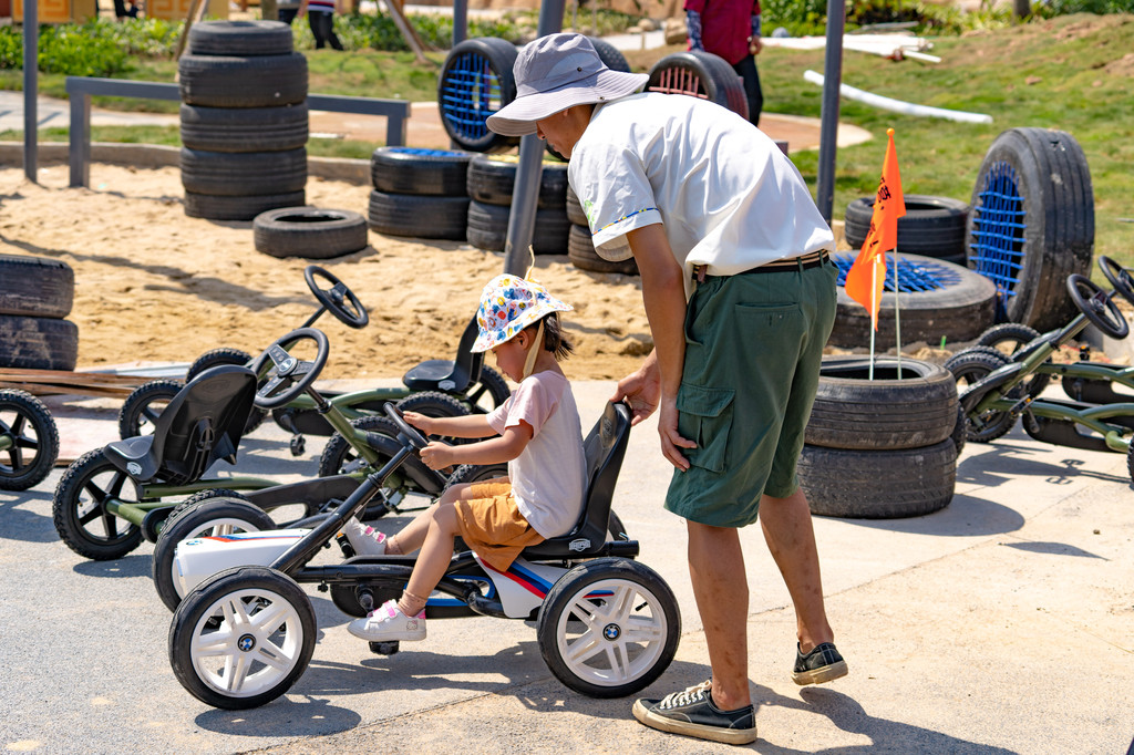 紧接着我们来到了这里的环海竞速区——踩踩卡丁车。之所以称它为踩踩卡丁车是因为他无动力,只能靠自己的双脚控制车速。里面有双座位的,也有单座位的。双座位利于和孩子培养感情,单座位利于和孩子在比赛中收获感情。踩完之后,很解压,很释放,不过有少许热,此时有个水上项目就好了。