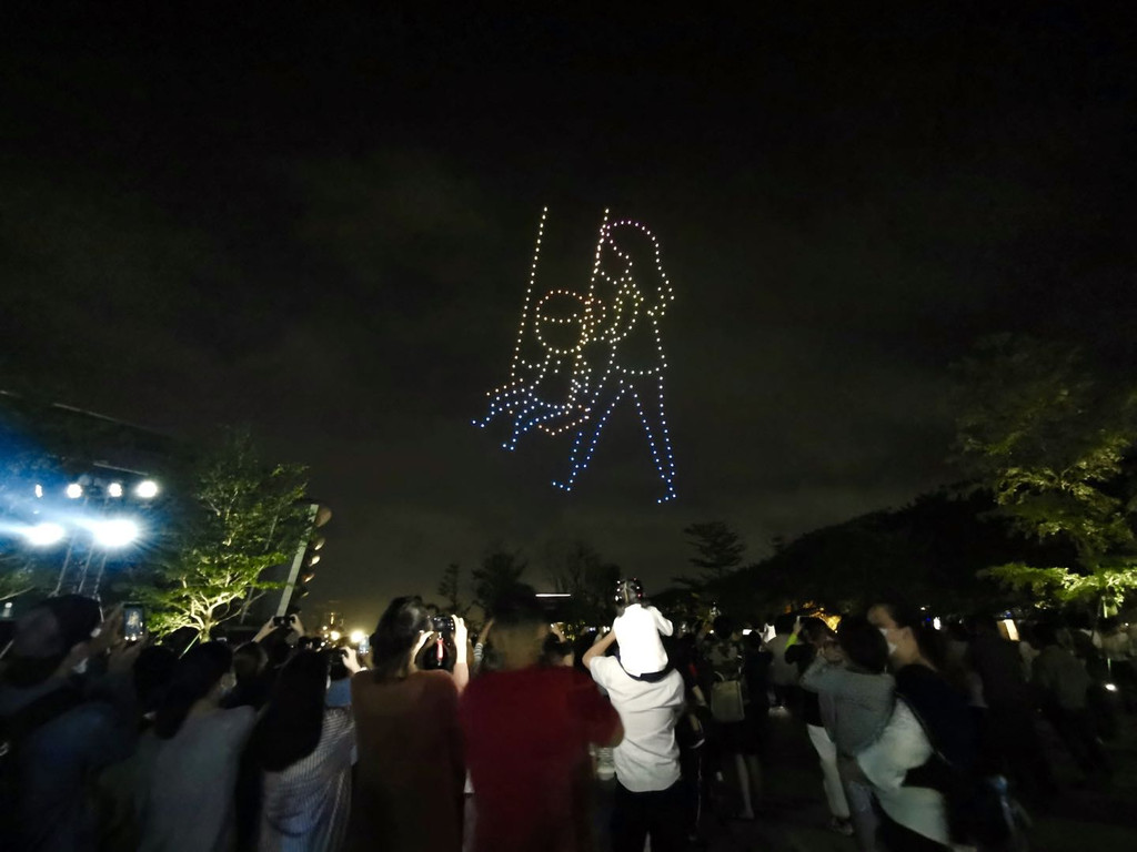 夜幕降临,无人机表演在晚上7.30分举行,7点的时候表演场地歌声响起,演唱的人听闻是这里营地教育部的小哥哥小姐姐,真是多才多艺,声音很动听!现场更是热闹,很多人早已将手机高高举起,等待无人飞机的出现。无人机一共拼成了9个图案,深刻地表达了对医务人员的致敬和星乐度·露营小镇重新开放的祝贺。现场更是哇声一片。