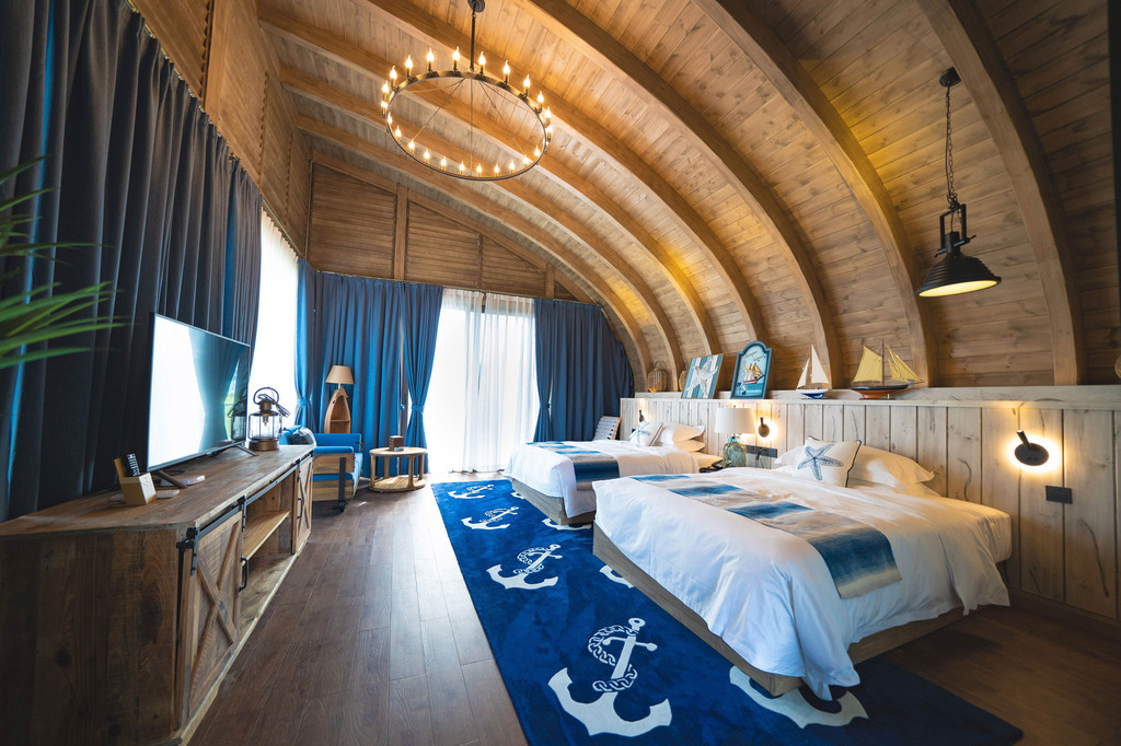 来到了我心爱的琴帆阁,外形像一把竖琴,造型新颖,有吸引力。外面还有一个小亭子,傍湖而居,傍湖而坐,喝着快乐肥宅水,看着外面美丽的风景,沐浴阳光。走进去发现,全木制作,木的墙壁,木的桌子,木的地板,高级的木香在房子里散发。里面摆放整齐,整洁,这样的房型建议一般入住1-2个人。此房型适合4-6人居住。