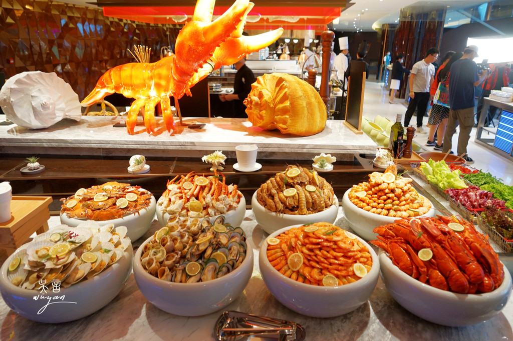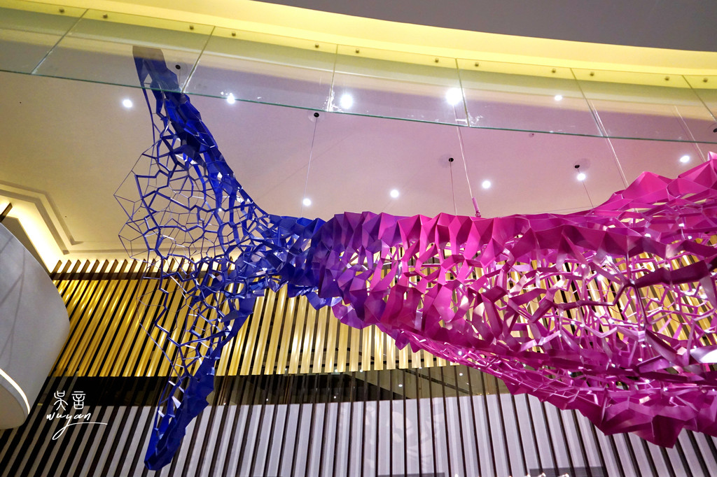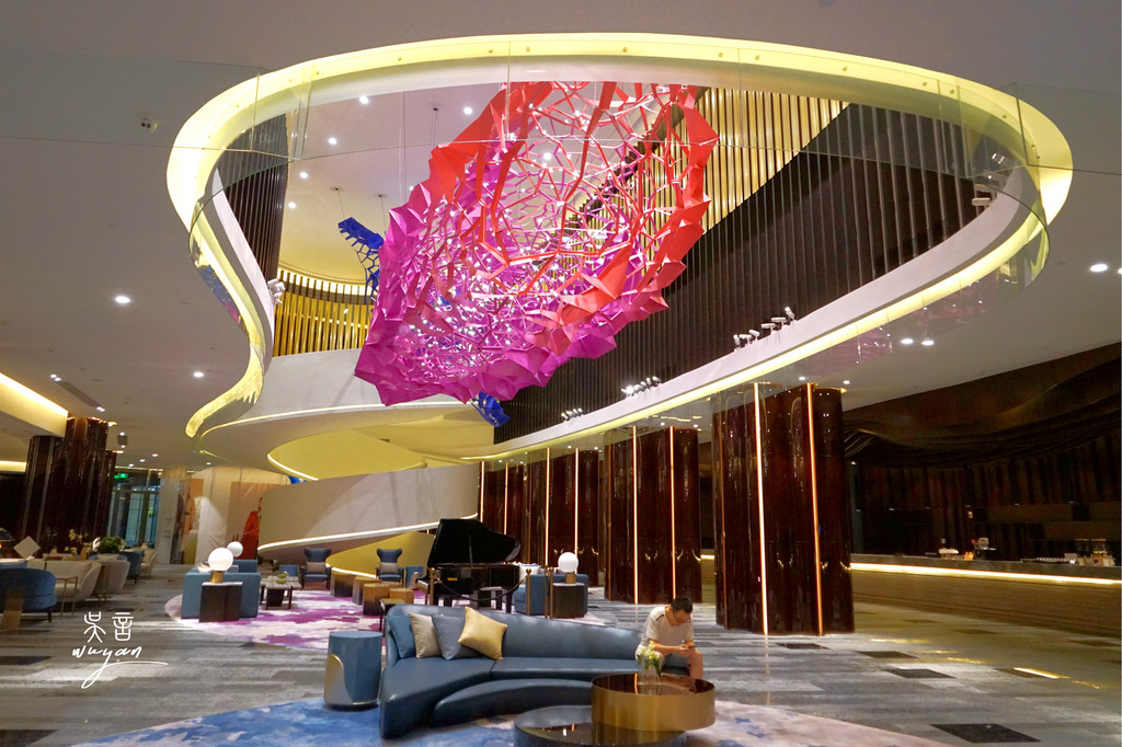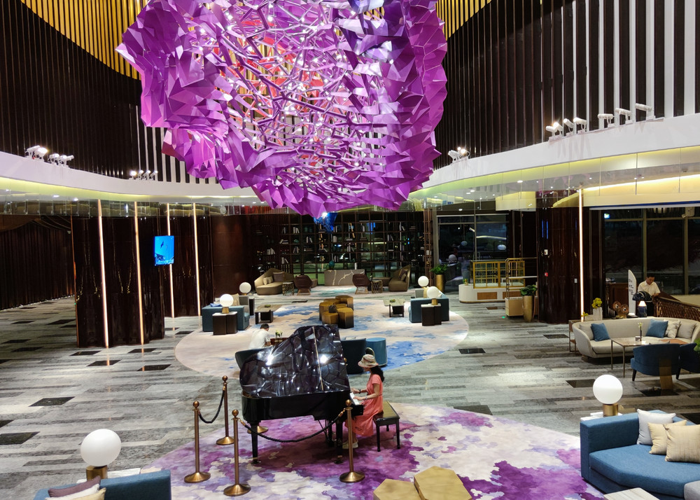 享用完大龙虾任吃的海鲜自助大餐,摸着滚圆滚圆、饱气足球一样的肚子,我们晃晃悠悠走到星海楼大堂,这才发现夜色下灯光璀璨的大堂,比白天自然光中的更加辉煌、更加夺目,天花板上的紫蓝色蓝鲸灯饰、雪白如绸的旋转楼梯、富丽堂皇的油画地毯,加上大楼外面呼呼而叫的台风夹雨,让人更加有身处豪华邮轮的幻觉。