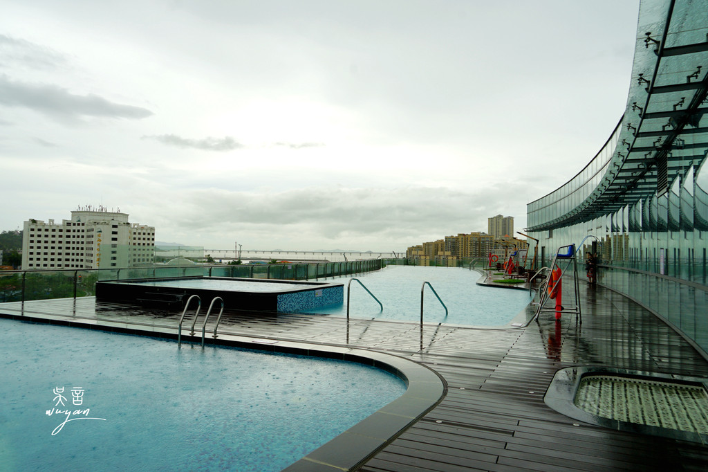 游泳池的水平面与远处的海平面刚好连成一线,畅游其中,一阵海风吹来,感觉仿若遨游在无边无际的大海中,舒畅极了。