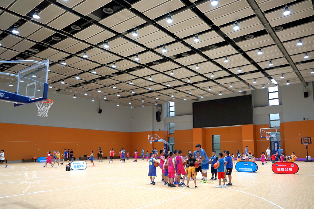 旅友的宝贝一进入康体中心一楼、面积1400多平方米、净高9.2米的羽毛球、篮球多功能馆,看到一群小朋友正进行篮球训练,腿脚已经不受自己控制,加入其中,玩得不亦乐乎,差点忘了刚刚还念念不忘的位于三楼的露天游泳池了。