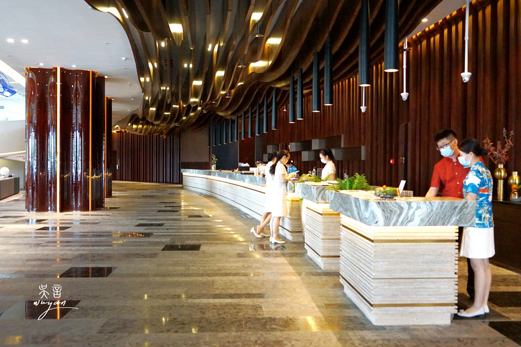 一步入大楼大门,波浪状的天花曲线优美,别具一格的分散服务前台后面,穿着椰林海滩风格的服务员带着阳光般的笑容,热情快速地为我们办理好了入住手续,还帮忙护送行李到房间里。