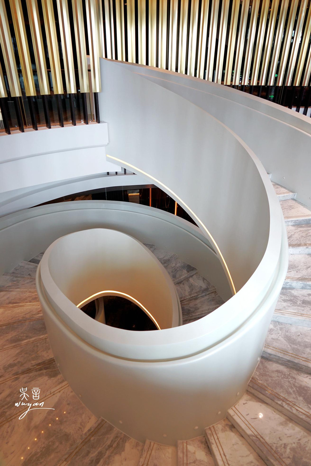 大堂的旋转楼梯,像白云像海螺像绸带,想像着一红衣礼服少女,拖着长长的裙摆,从楼梯上像燕子般轻盈而下,那该是多么美的画面。