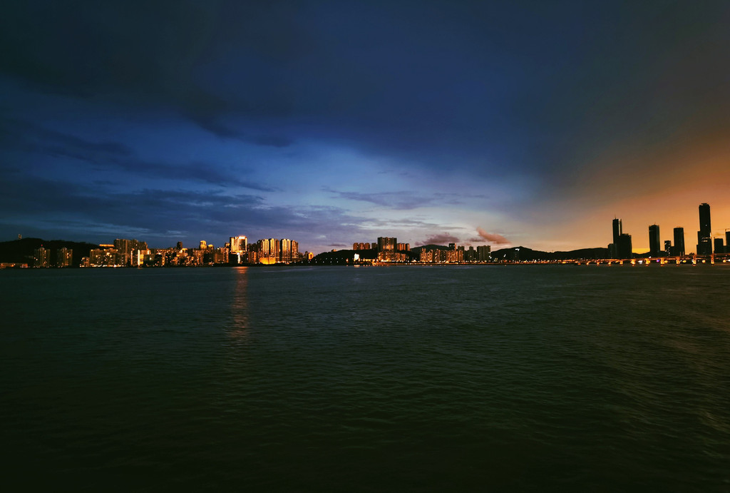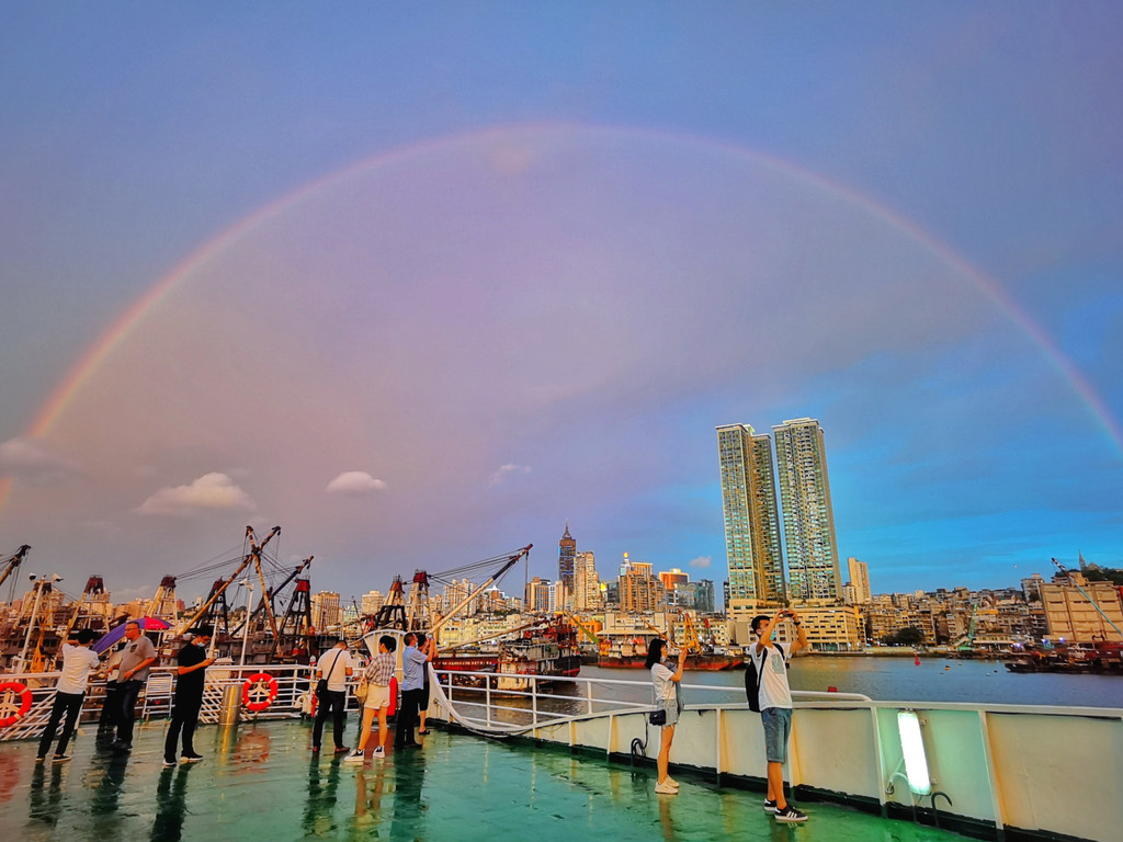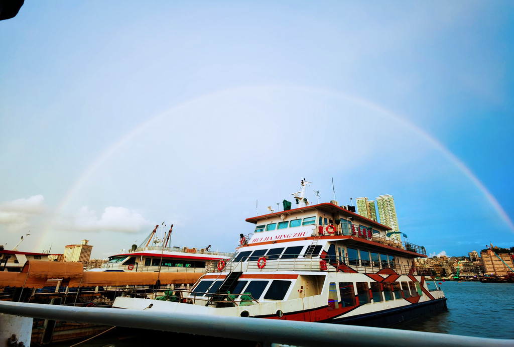 也许是上帝看出了我对港珠澳海湾夜游的心向往之,便给我策划了一场意想不到的惊喜。晚餐过后我们回到湾仔码头,那时下了点小雨,让港口变得有些雾气蒙蒙。不一会儿雨变得小了起来,太阳又重新洒向海湾。这时天空突然出现一道彩虹,横跨了整个港珠澳大桥,是的,是彩虹,而且是双层彩虹。