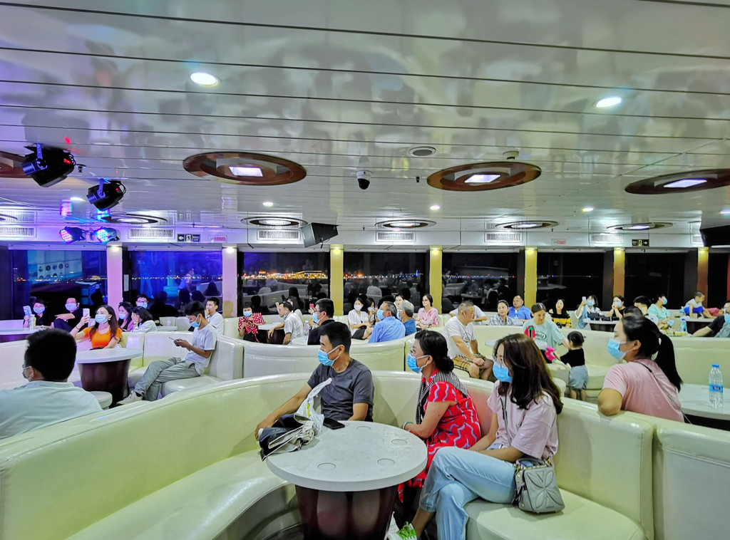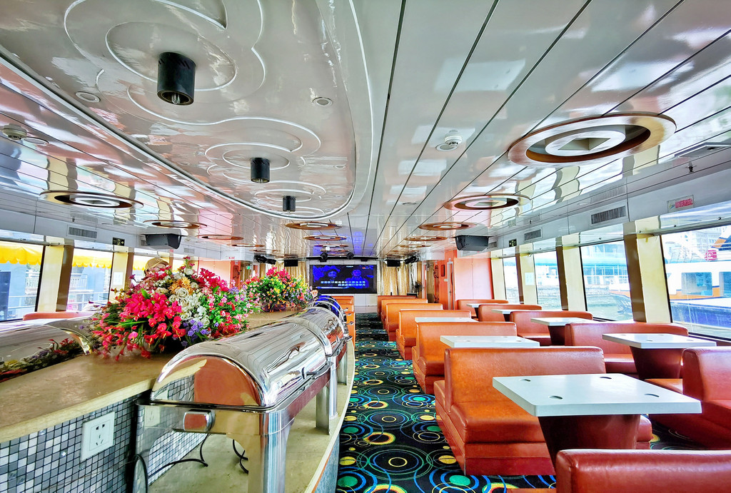 船舱内部装修豪华大气,舱内陈设了桌椅,可供游客们休息观赏、打卡拍照。二层船舱内有精美的糕点和小丑表演,以及书法家亲笔创作的字画,如果你喜欢,只需要花一百元成本费就可以带回家。三层是全开放的甲板,可以360度观赏珠澳海湾的壮丽景色。