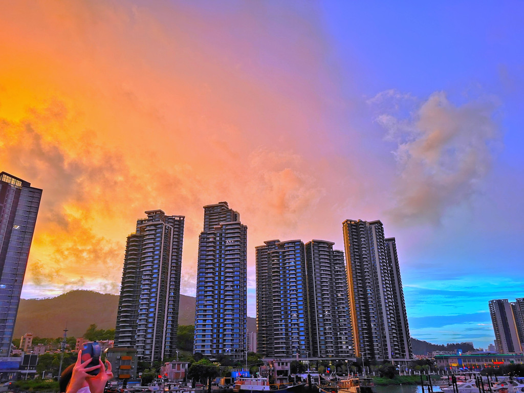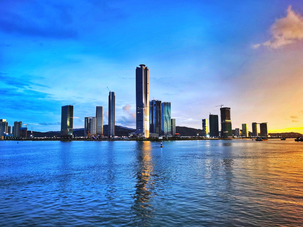暮色中的横琴金融岛一半斜阳一半阴凉。横琴金融岛位于横琴新区东北部,定位为率先承接港澳服务功能的区域性商务服务基地、南中国的地标性门户、充满活力的滨水目的地和经济、环境和社会持续发展的社区。经历9年沉淀,横琴的高楼天际线已经逐渐显现。从千帆成影、百舸争流到晨曦日暮、潮起潮落,造就了眼前的横琴,如今,拔地而起的高楼,迎面扑来浓厚的摩登气息。
