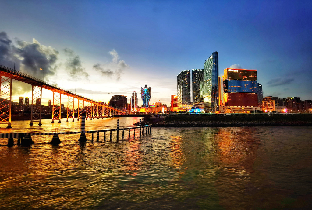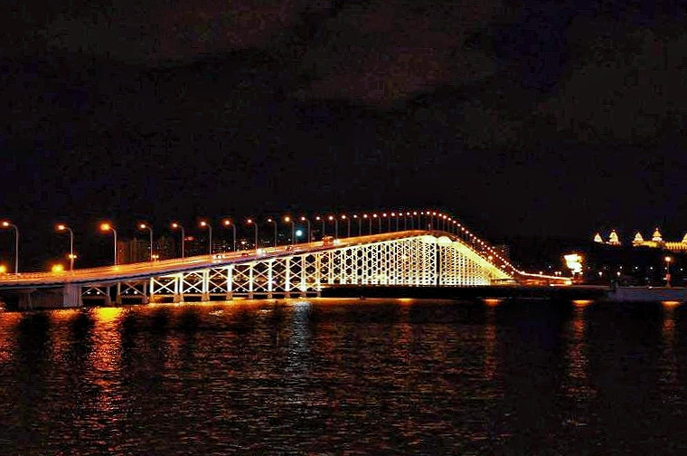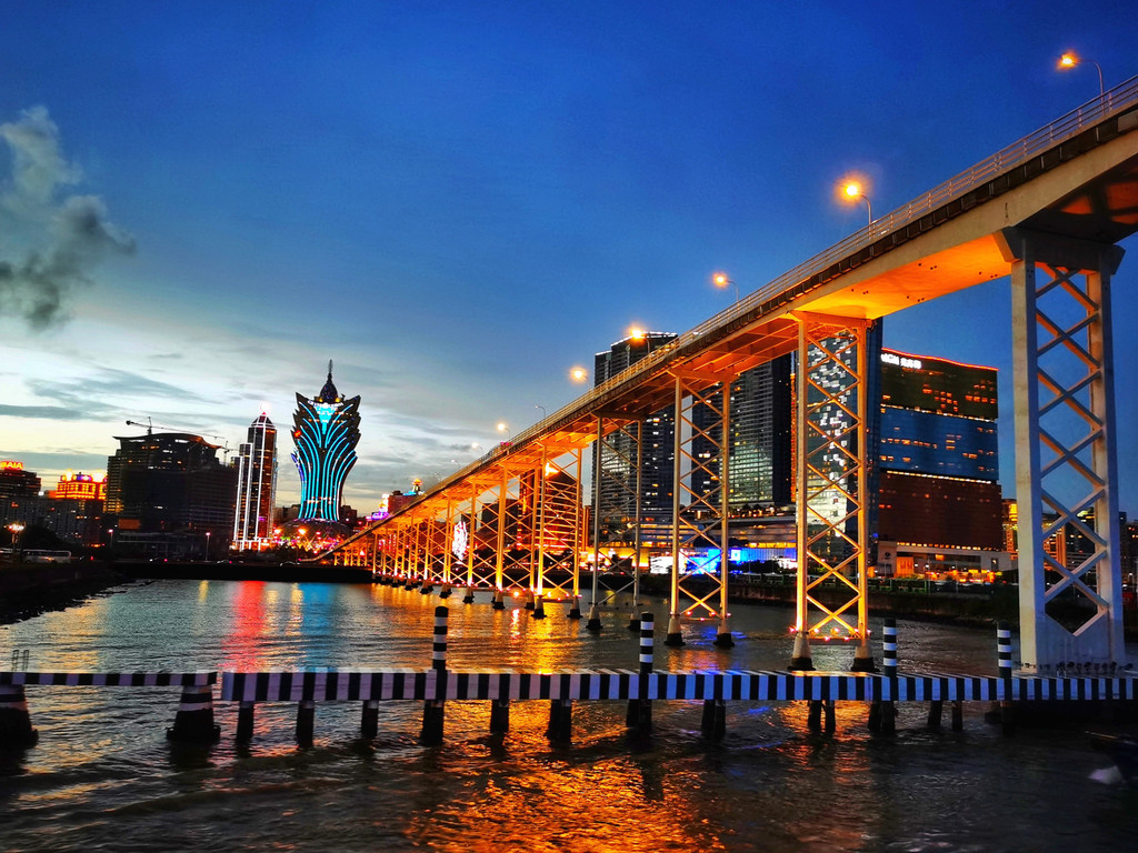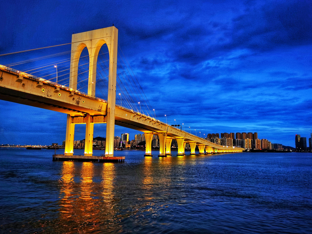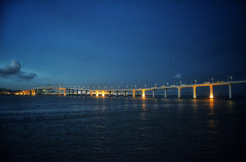 夜色下的澳凼大桥,从海面上看蜿延起伏,如一条蜿蜒起舞的巨龙。澳凼大桥也是连接澳门半岛和凼仔岛的跨海大桥,它的长度达到2.56公里,比西湾大桥还要长。
