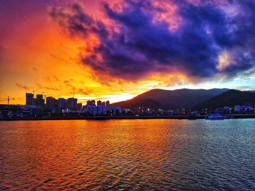 天色慢慢暗去,天空出现了火烧云,海平面上一半夕阳,一半蓝天。这般美景瞬间将这次旅程推向了高潮。我激动的心似乎要跳出来了。