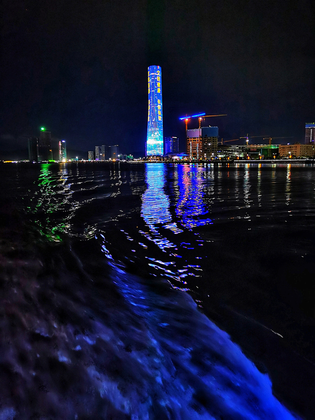 湾仔旅游码头是航线的起止点,途经珠海国际会展中心、横琴金融岛、澳门新葡京娱乐城、澳门三座跨海大桥、珠澳口岸人工岛、最后看到世纪工程——港珠澳大桥,作为世界最长的跨海大桥,全长55公里,由桥岛隧和粤港澳连接线组成,创下多个“世界之最”,它是全球第一例集桥、岛、隧道为一体的跨海大桥,建设难度极高,即使在国外顶尖桥梁专家眼里,它也是“全球最具挑战的跨海项目” ,全长55公里的港珠澳大桥夜景灯光今后将采用日常和假期双模式,日常模式返璞归真,以白色为主色调呈现大桥本色;变色LED灯下的灯火阑珊处,满足了我电视剧里女主角的 幻想。为了能看到白天与夜晚不同景色的变化,我们一天内体验了两次航线。“珠澳海湾日游”以及珠澳海湾夜游。