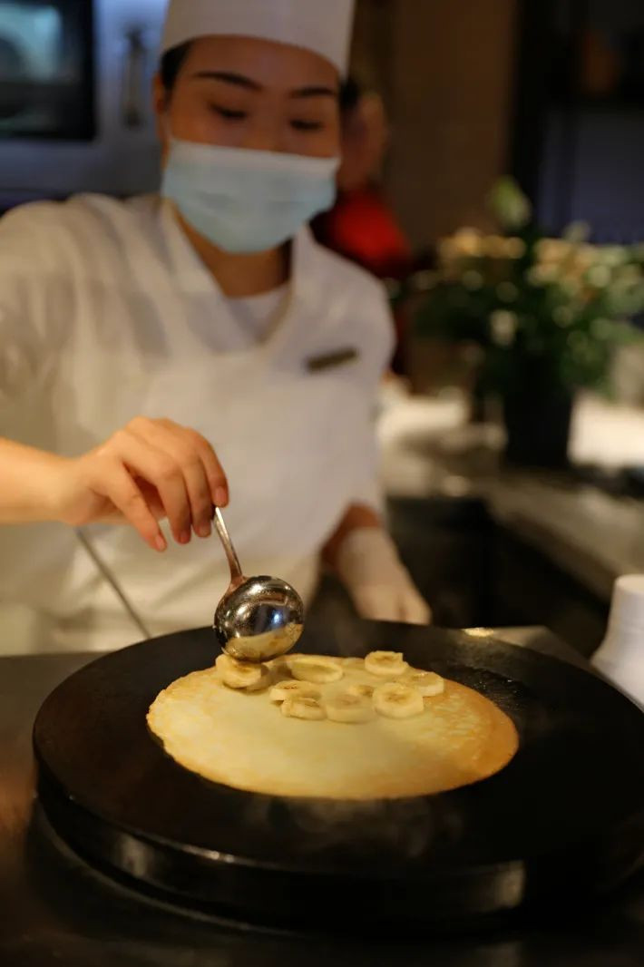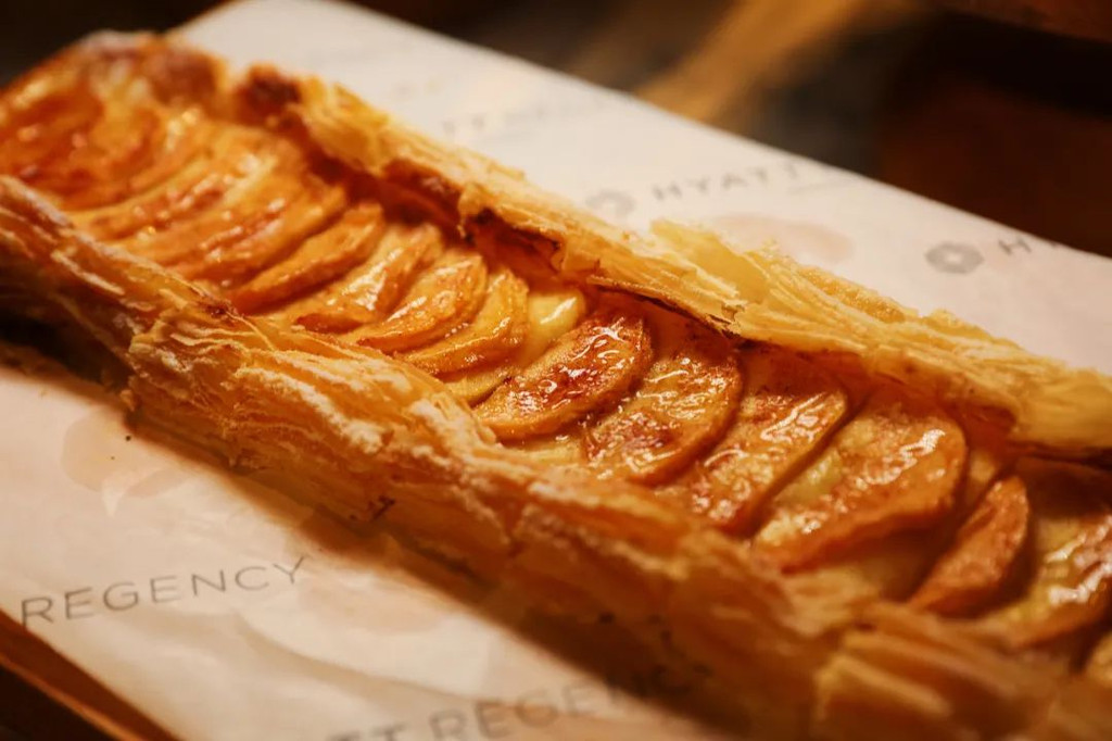 而且针对不同节日,厨师还会精心准备很多特色的蛋糕,例如我们去的时候刚刚是万圣节,就有很多有万圣节特色的蛋糕推出来,每隔一段时间厨师都会拿一款蛋糕现切给大家。除了甜点,在大堂酒廊里还有很多的隐藏神秘餐单是很值得推荐的。现烤现做的香蕉派。